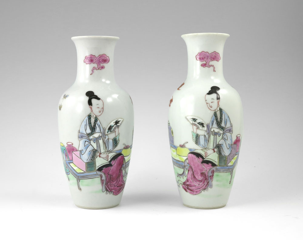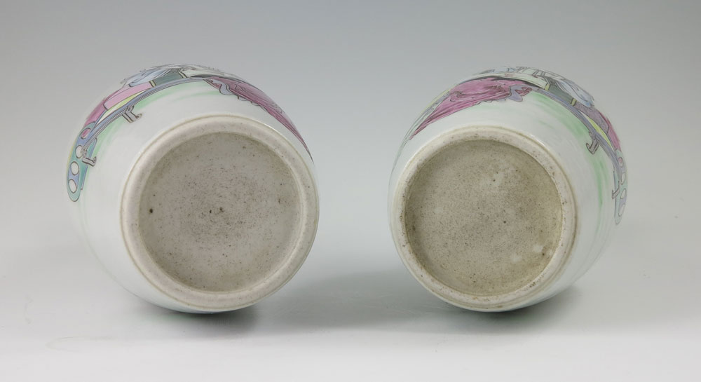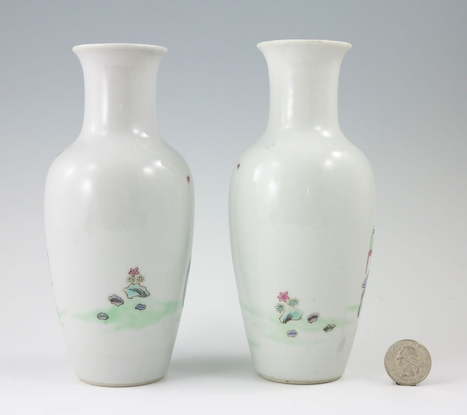 PAIR CHINESE MIRROR IMAGE FAMILLE ROSE VASES: 7'' tall.