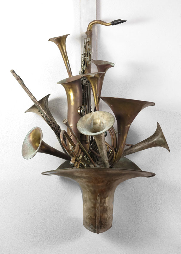 MUSICAL INSTRUMENT WALL FOUNTAIN: A unique wall fountain created by welding various brass instruments together with a tuba horn as a water reservoir. Perfect for that special musician in your life. Approx. 45'' h. x 30 1/2'' x 19 1/4''.