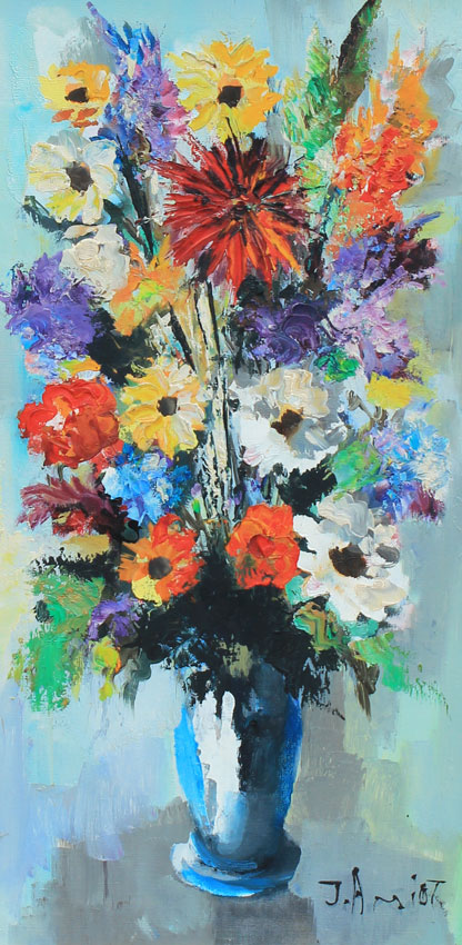 AMIOT, Jean, (French, 1939- ): Still Life with Flowers in a Vase, oil/Canvas, 31'' x 16'', signed lower right, encased in original frame with fabric liner, 39 1/2'' x 24 1/2''.
