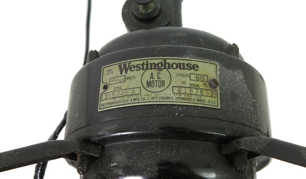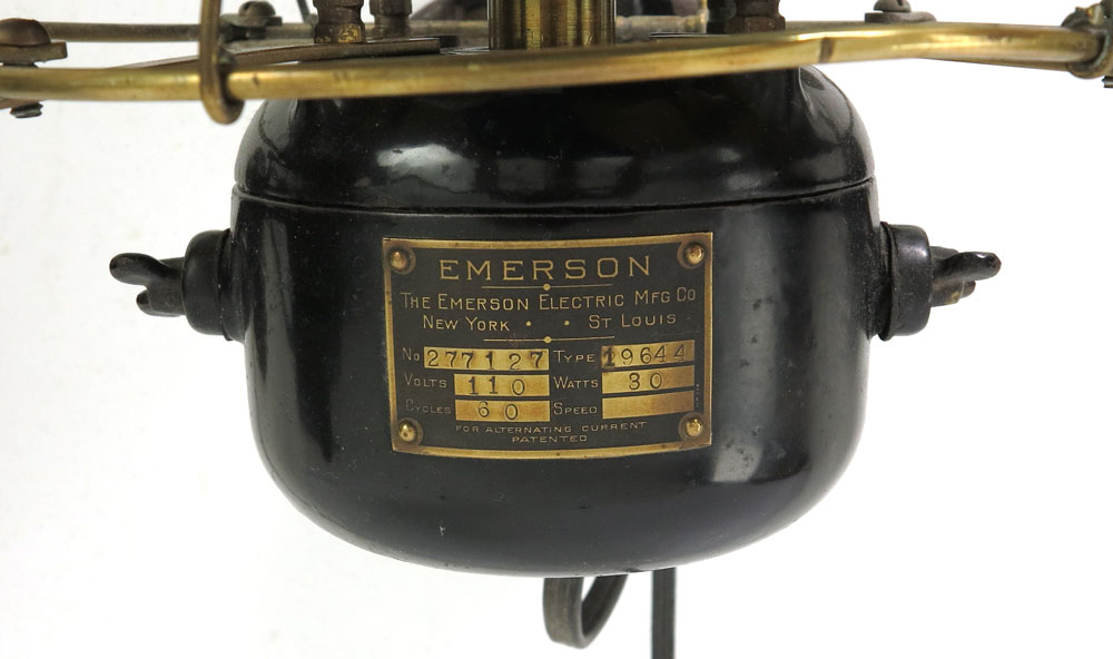 4 PIECE ANTIQUE ELECTRIC FANS: To include 1) General Electric brass and cast iron, 20'' h. x 17'' x 12 1/4''. 2) Pair of Westinghouse wall mounted or tabletop, cast iron with wood blades, 17'' x 13'' x 9 1/2''. 3) Petite Emerson brass and cast iron, 11 3/4'' x 9'' x 7 1/2''.