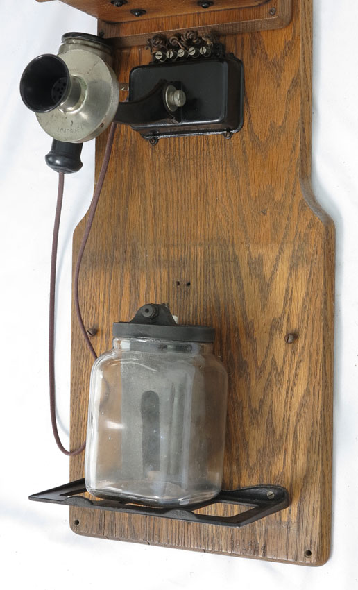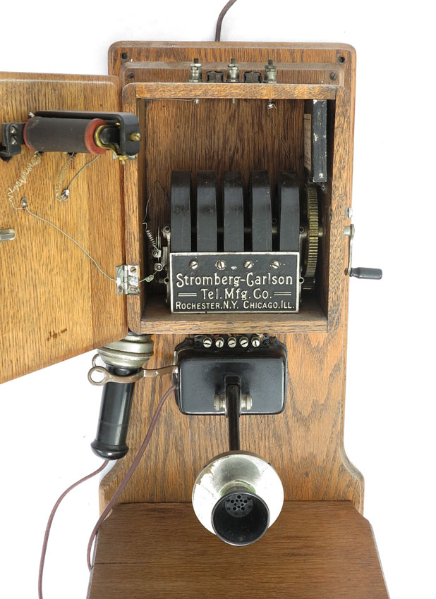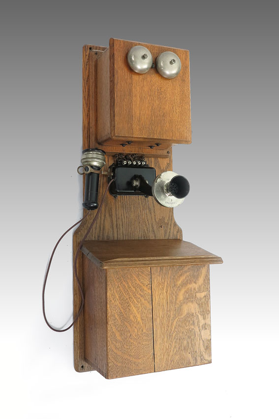 STROMBERG CARLSON OAK DOUBLE BOX WALL PHONE: Cranks and bells ring. Lower box opens to reveal D. A. Kusel battery. Measures 32'' h. x 12 '' x 8''