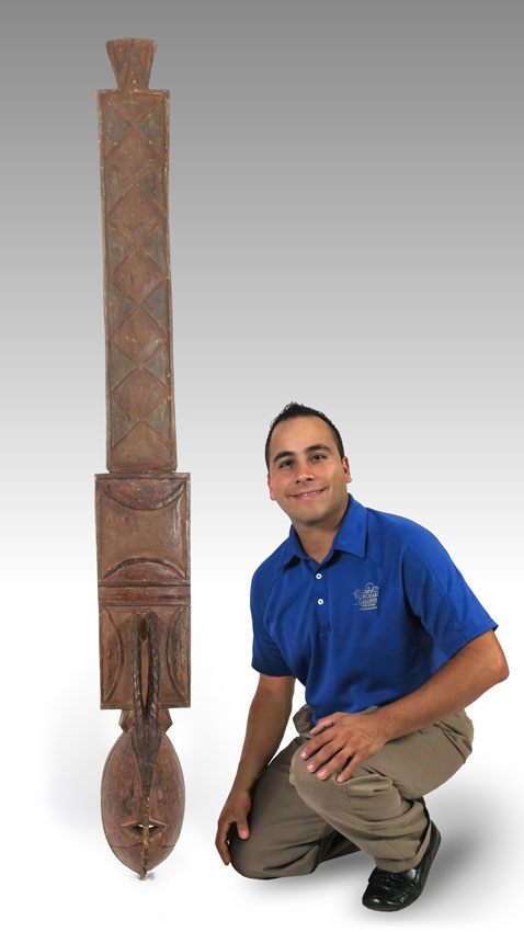 CARVED AFRICAN MOSSI PLANK MASK BURKINA FASO: 6 LBS., 70'' x 8'' x 7''.