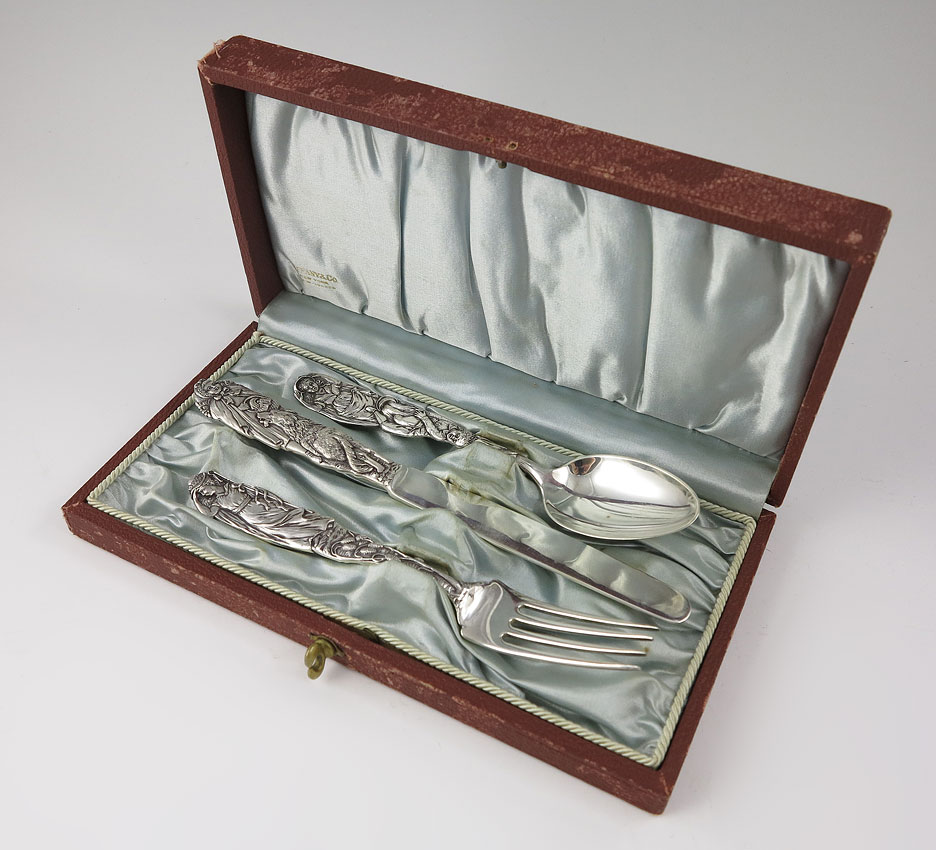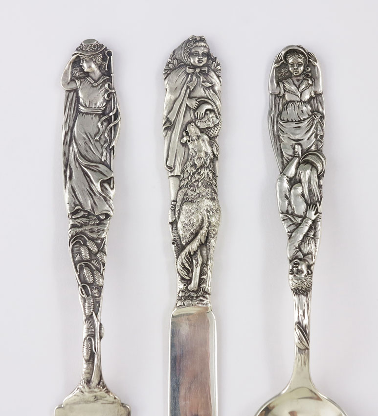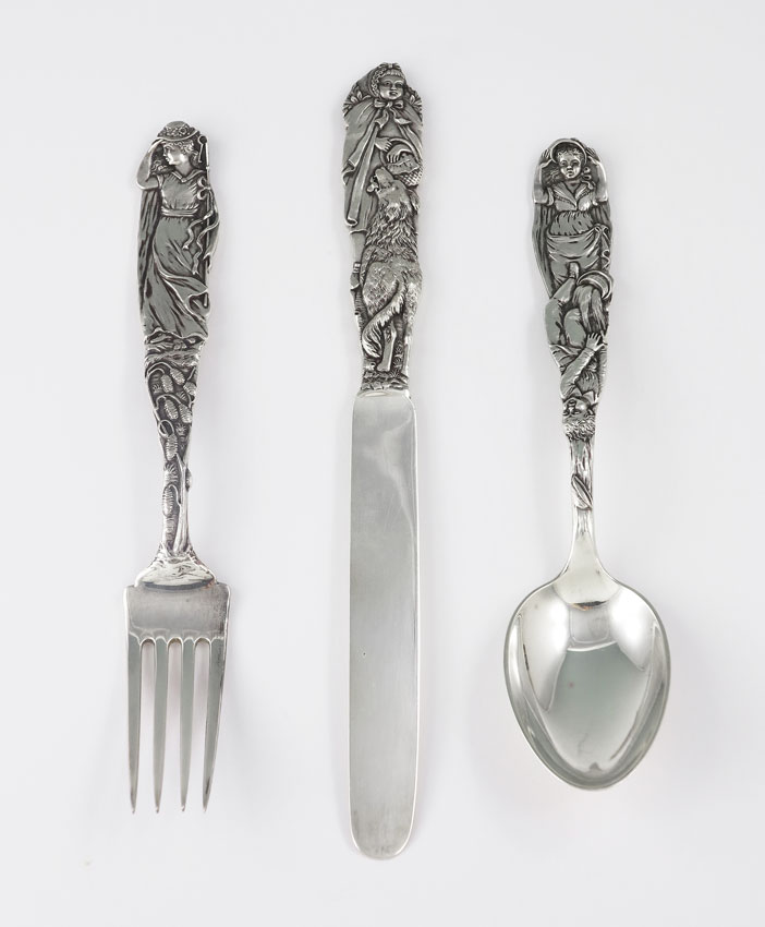3 PIECE TIFFANY STERLING NURSERY RHYME CHILDS SET: To include Little Bo Peep fork (6 3/4''), Jack & Jill spoon (6 3/8''), and Little Red Riding Hood knife (7 1/2''). Each marked Tiffany & Co. Sterling, knife also marked 1090. Sold with original Tiffany & Co. presentation box. 1 1/2'' h. x 8 3/4'' x 4 1/2''. Approx. 5.4 troy oz.