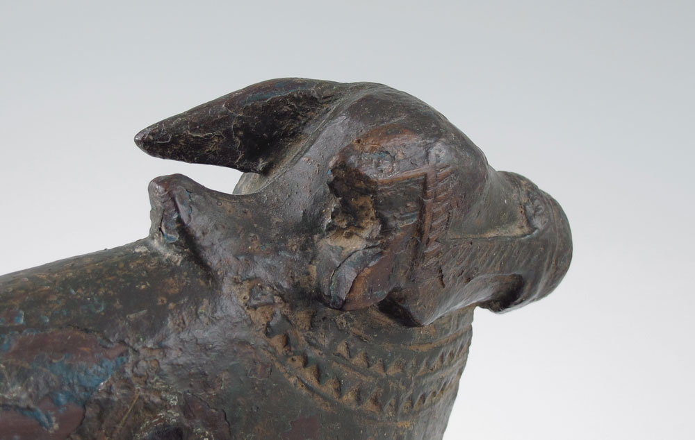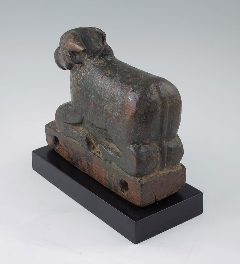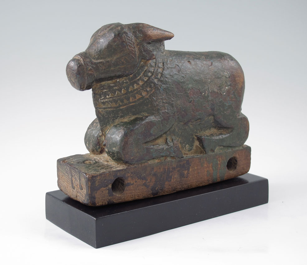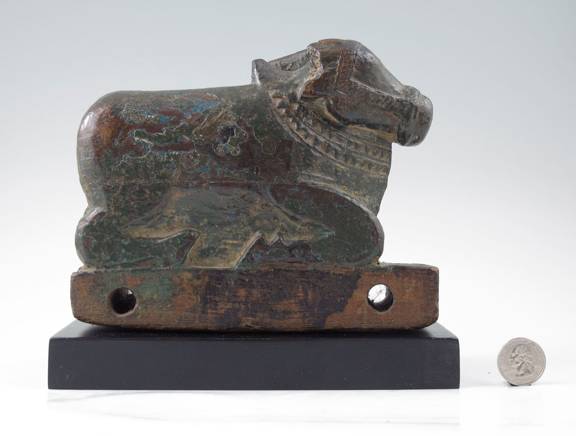 CHINESE CARVED AND PAINTED WOOD RECUMBENT OX: Green painted and carved resting ox, age unknown. Measures 6''h. x 7 1/2'' x 2 1/2''. Sold with wood base, 1''h. x 8'' x 3 5/8''.