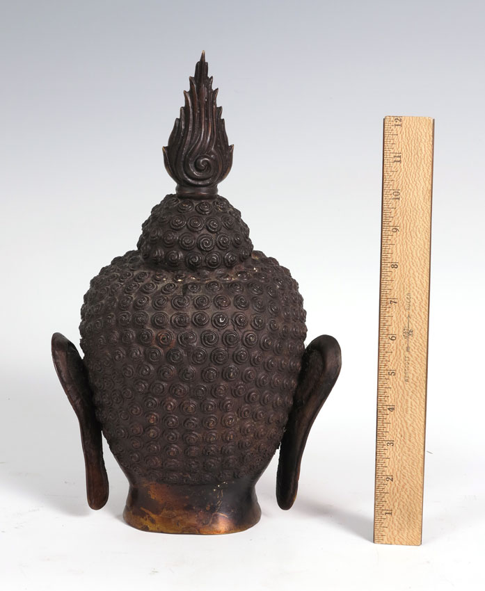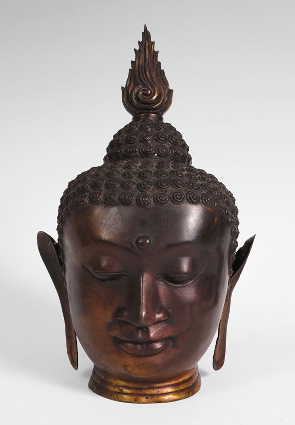 BRONZE BUDDHA BUST: Thin cast bronze, age unknown. 13 3/4'' h. x 8 1/4''.