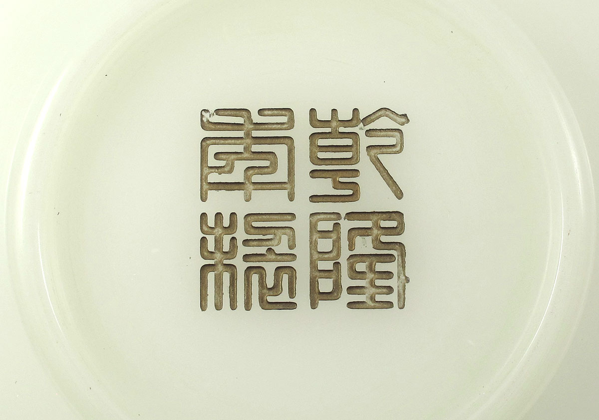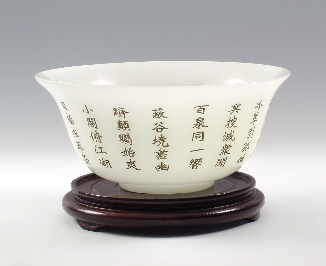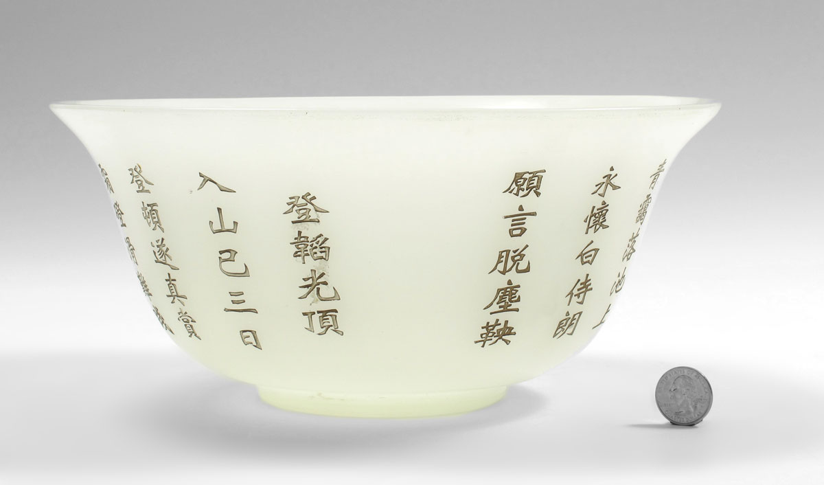 CHINESE BEIJING STYLE JADE GLASS BOWL: With an abundance of carved characters, perhaps telling a story. 11 1/2'' dia. x 4 1/2'' high.