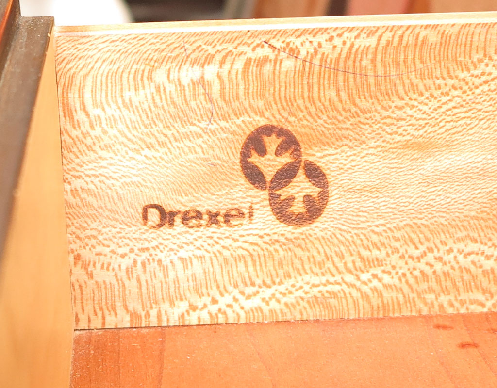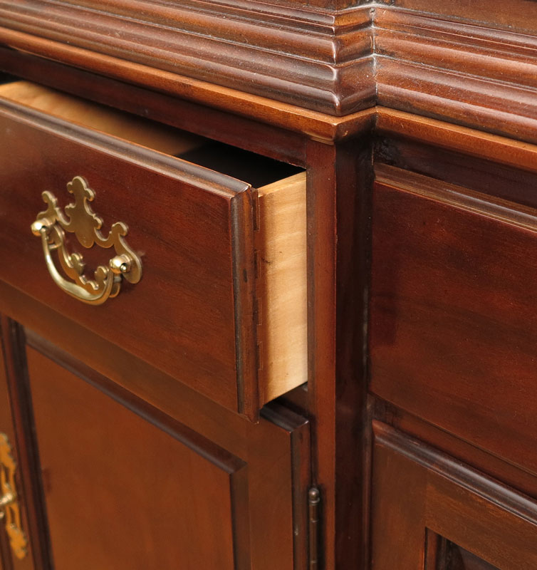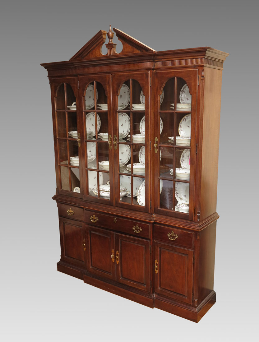 DREXEL VINTAGE CHERRY CHINA CABINET: Architectural crest with urn finial, 4 paneled glass doors on top section. Illuminated interior with 3 glass shelves. Base with 3 drawers over 4 doors. 92''h. x 55''w. x 14''d.