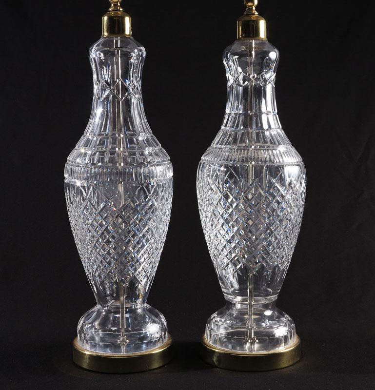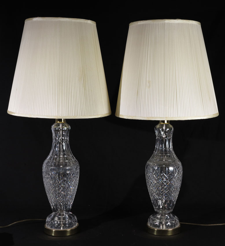 PAIR WATERFORD CRYSTAL TABLE LAMPS: Matched pair, marked Waterford, overall 36 1/2'' h. x 6'' dia. Sold with shades.