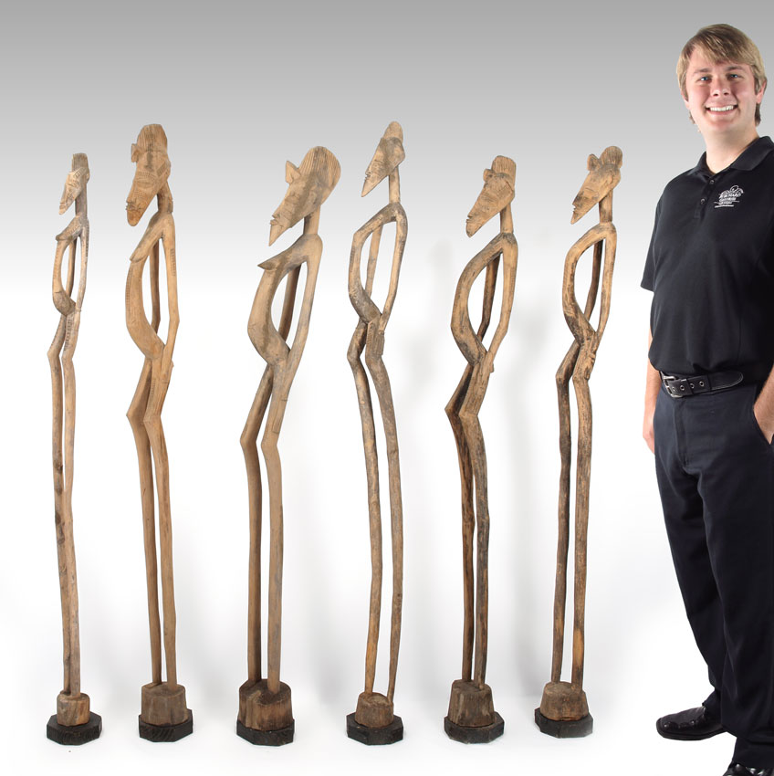 CARVED AFRICAN LOT OF 6 SENUFO RHYTHM POUNDERS: 4 - 7.5 LBS., 64'' x 4'' x 6''.