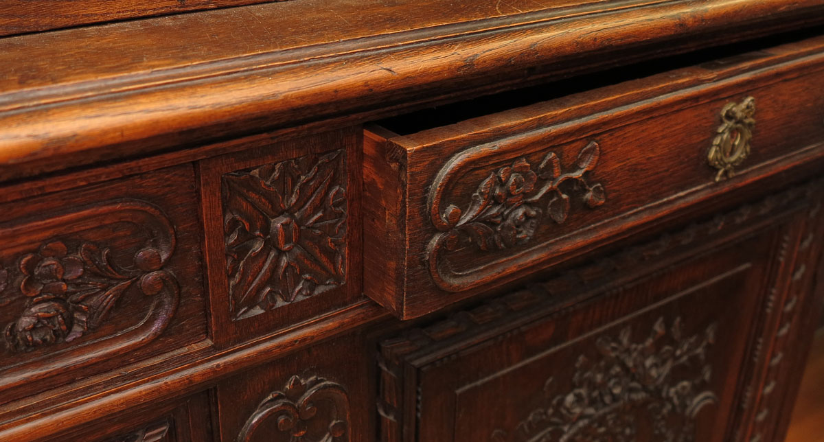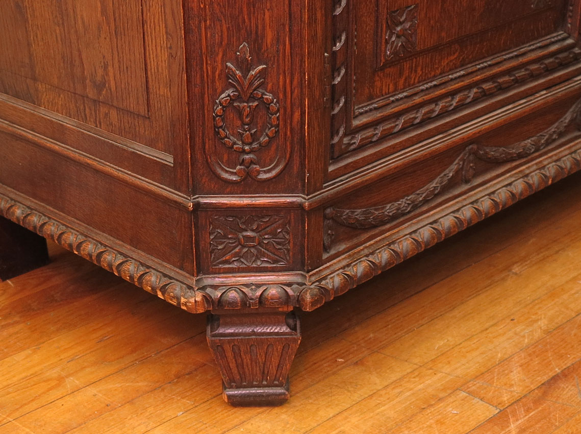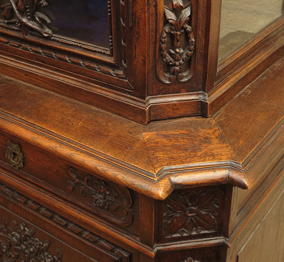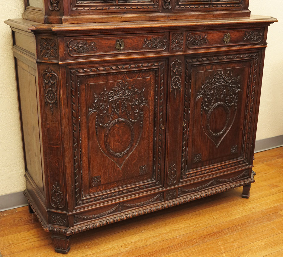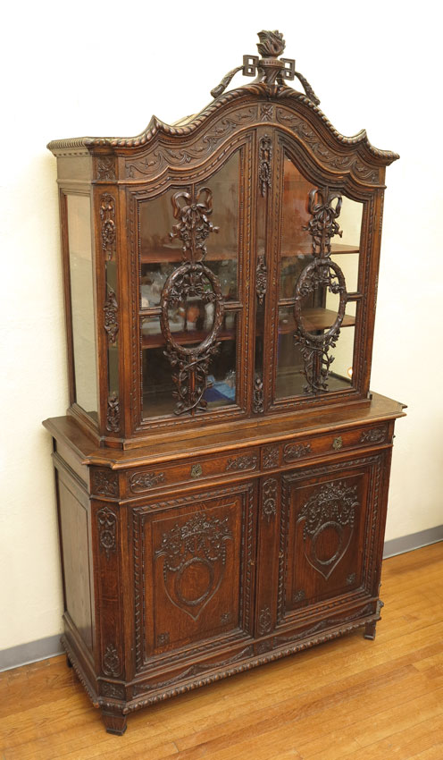 RICHLY DECORATED CONTINENTAL CUPBOARD: Flame finial with shaped crest, carved accents. Illuminated top section with glass doors and sides, with floral swags and festoons on front. Lower section with shaped top, 2 drawers over 2 carved panel doors on straight feet. Keys in office. Overall 96 1/2'' x 55'' x 21 3/4''.