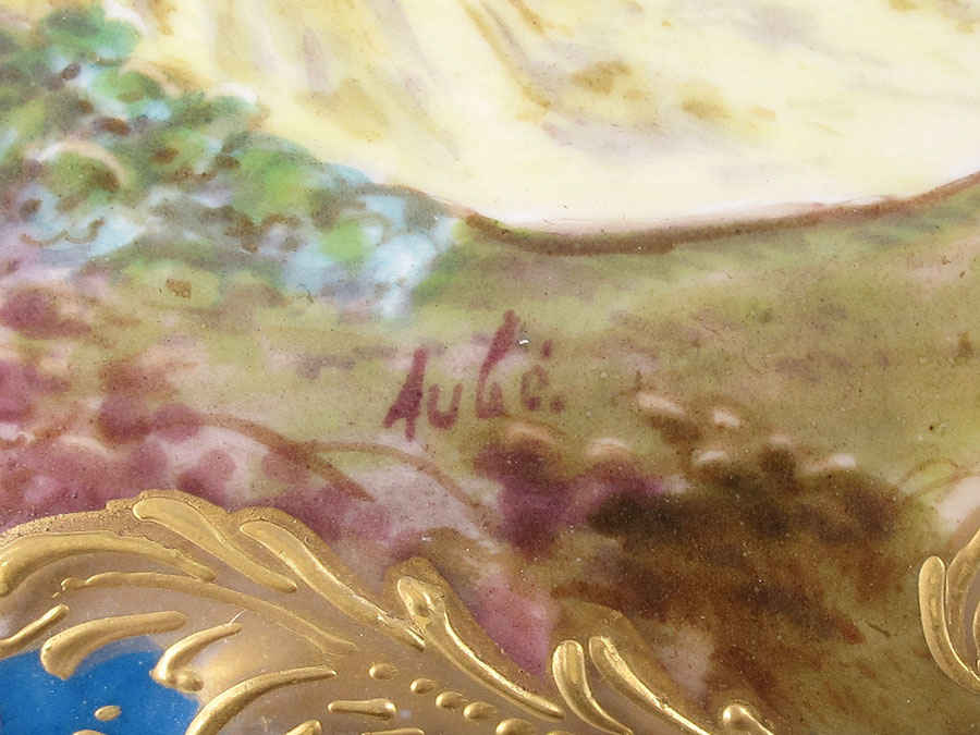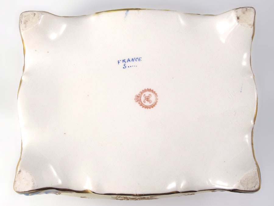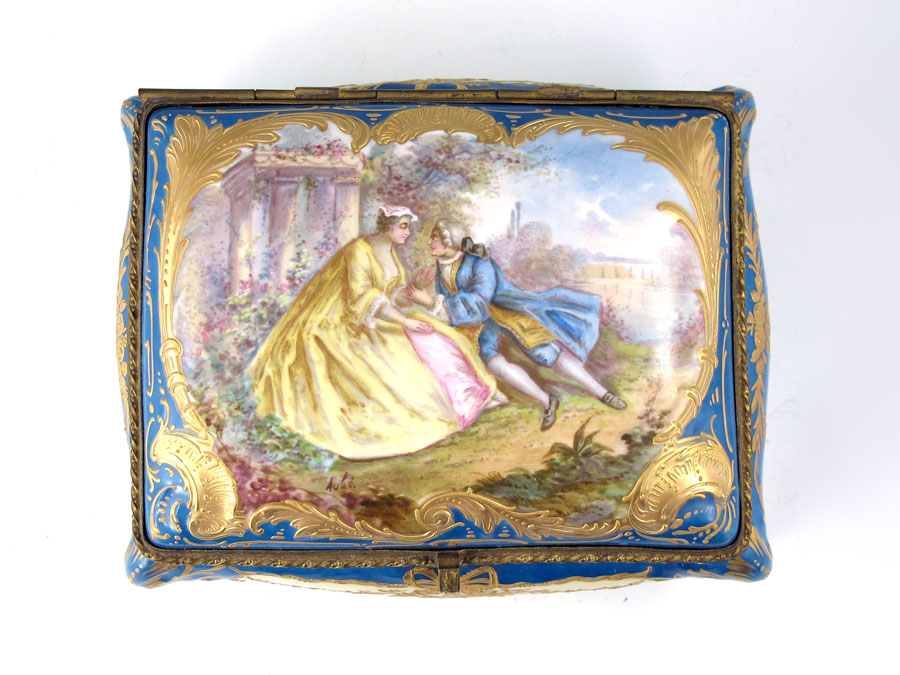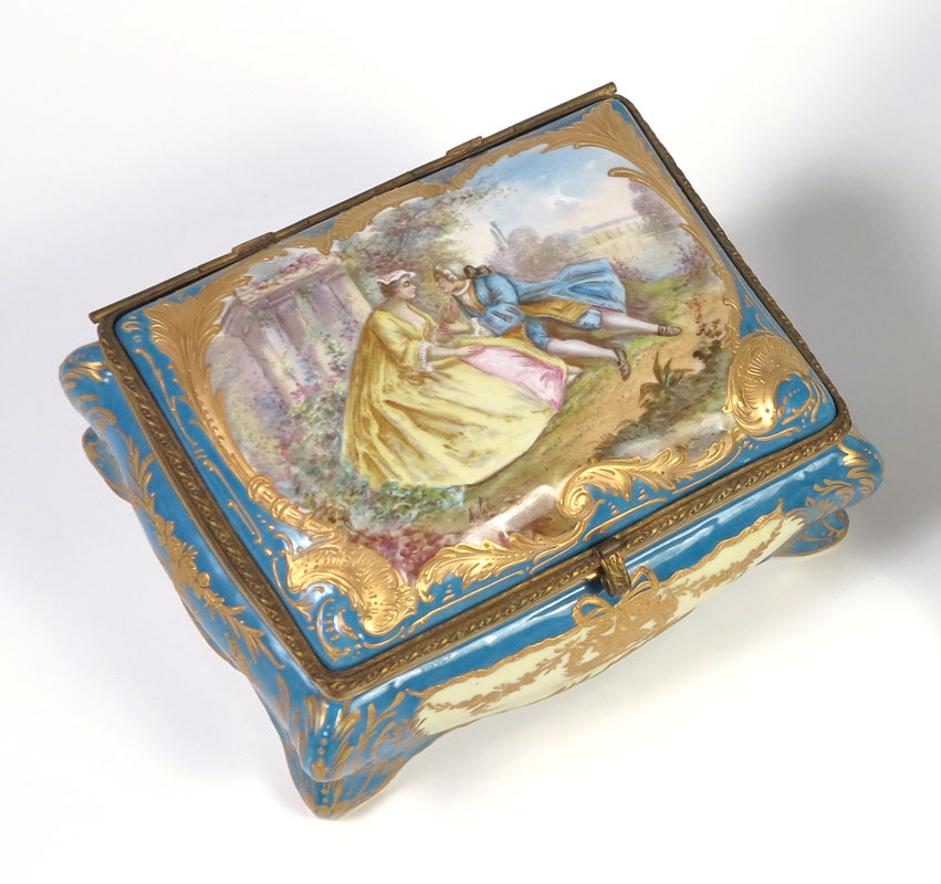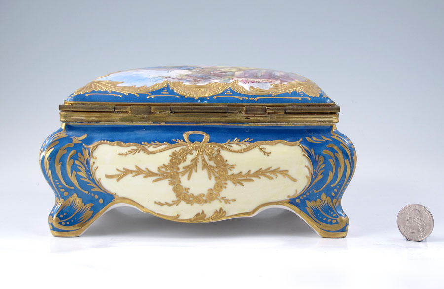 FINE FRENCH PORCELAIN BOX IN THE MANNER OF SEVRES: Hand painted courting scene on the hinged top, framed by raised gold scroll work. The interior with hand painted floral sprays. Bombay sides, scrolled feet. 4 1/2'' x 8'' x 6''.