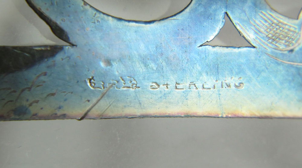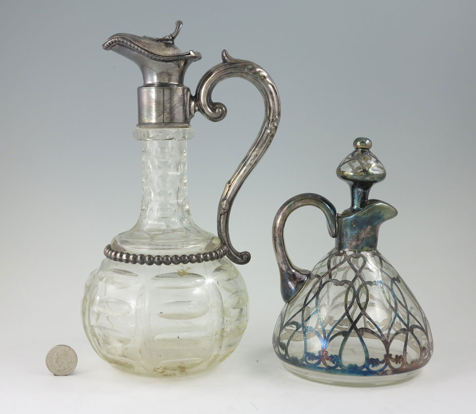STERLING OVERLAY DECANTER AND SILVERPLATE MOUNTED CLARET JUG: 2 piece to include 1) Illegible marked sterling overlay clear glass decanter with stopper, overall 7 3/8'' h. x 4 3/4''. 2) Silverplate mounted claret jug with cut glass body. Unmarked, 10 1/4'' h. x 5''.