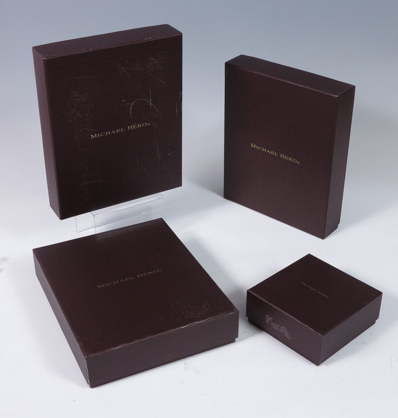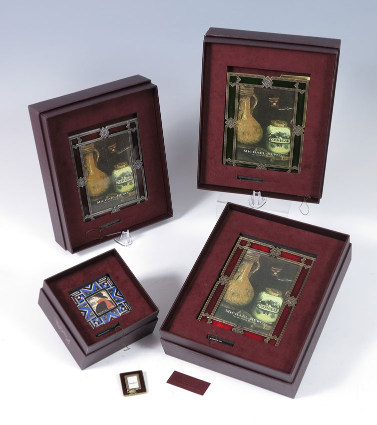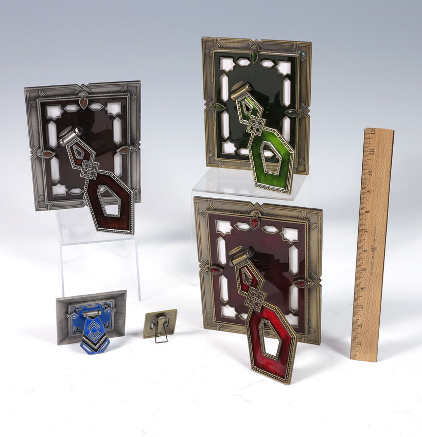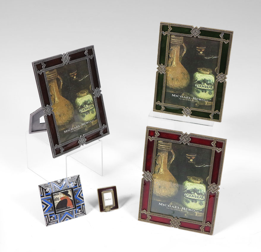 5 ENAMELED PICTURE FRAMES: A miniature Jay Strongwater frog decorated enameled frame, 2'' x 1 5/8''. Sold together with 4 Michael Hero, new in the box, enameled frames. Three are 8'' x 6 1/4''. The fourth is the 3 1/2'' square frame set with Swarovski crystals.