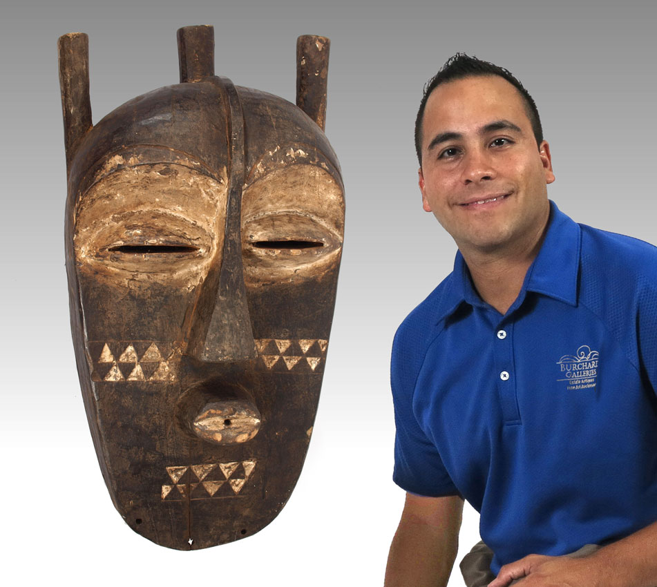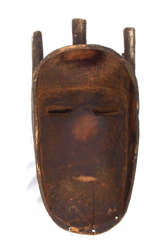 CARVED AFRICAN YOMBE MASK - DEMOCRATIC REPUBLIC OF CONGO: 8.5 LBS., 29'' x 15'' x 11''.