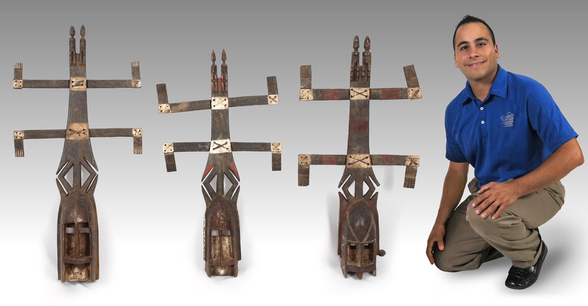 CARVED AFRICAN 3 PIECE DOGON KONGA MASK - MALI: 4.5- 5.5 - 5.5 LBS., max. 52'', 42'' x 21'' x 7''.
