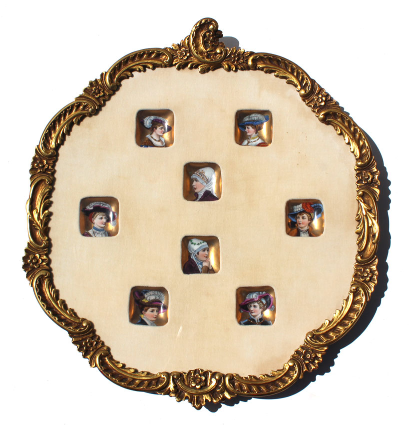 GROUP OF 8 HANDPAINTED MINIATURE PORTRAITS ON PORCELAIN: Framed together, under glass, in a deep dish gilt frame, 22'' x 20''. Porcelains measure approx. 2'' x 2''.