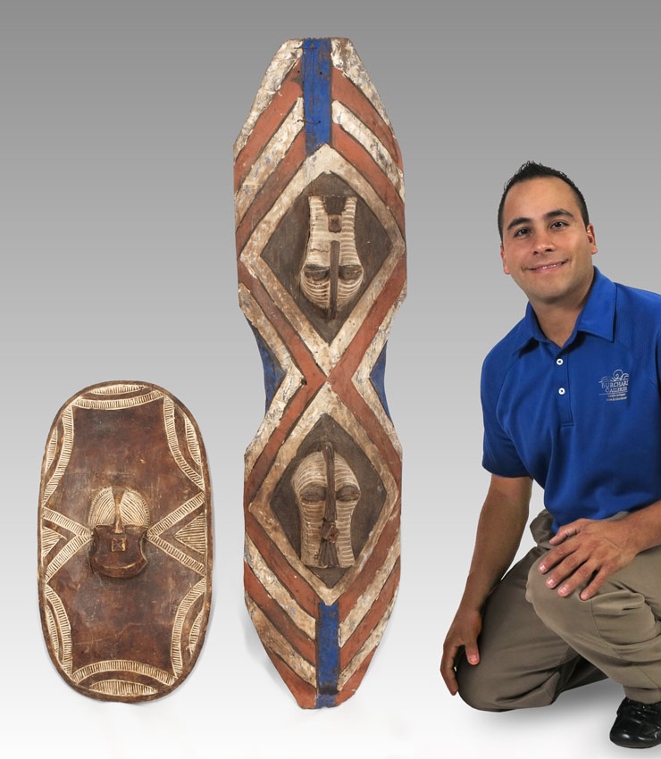 CARVED AFRICAN 2 PIECE SONGYE SHIELD - DEMOCRATIC REPUBLIC OF CONGO: 7 LBS., 49'' x 12 1/2'' x 7'' & 2 LBS., 24'' x 13'' x 4''.