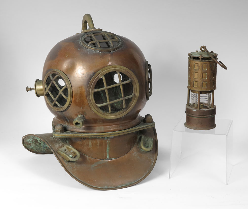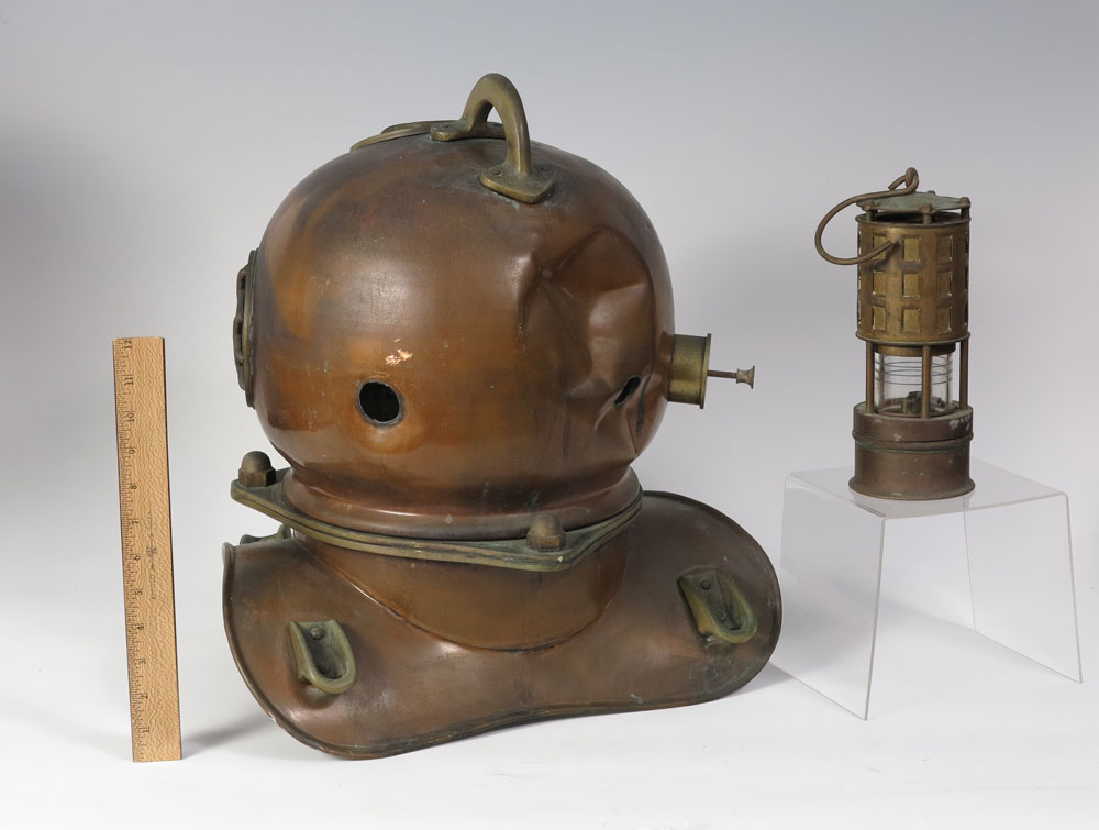 COPPER & BRASS DIVING HELMET: Decorative example copper and brass construction. Unmarked. Measures 18 3/4'' h. x 17 1/2'' x 16''. Sold with a vintage Koehler ships oil lantern. 9 1/2'' h. x 3 3/4''.