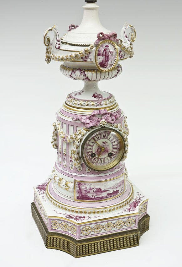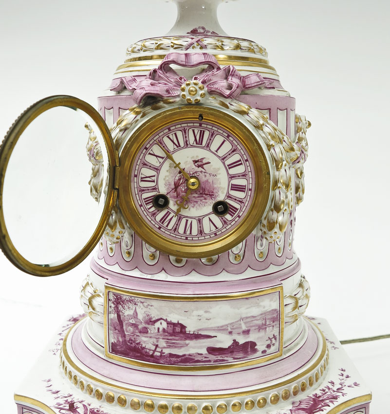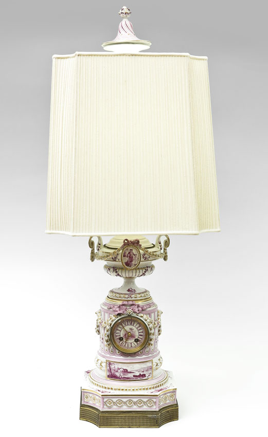 FRENCH ROCOCO PORCELAIN CLOCK LAMP: Turn of the Century Era with porcelain body depicting genre scenes and portraits, also with floral motifs with pierced brass base, porcelain dial with birds and Roman numerals. Signed Japy Freres time and strike movement. Top section of lamp painted metal, glass shade, porcelain finial, overall measures, 40 1/2'' h., x 10'' square, sold with outer cloth shade, 16 1/4'' h., x 16 1/2'' square.