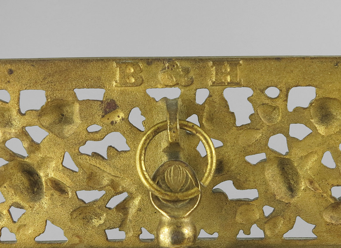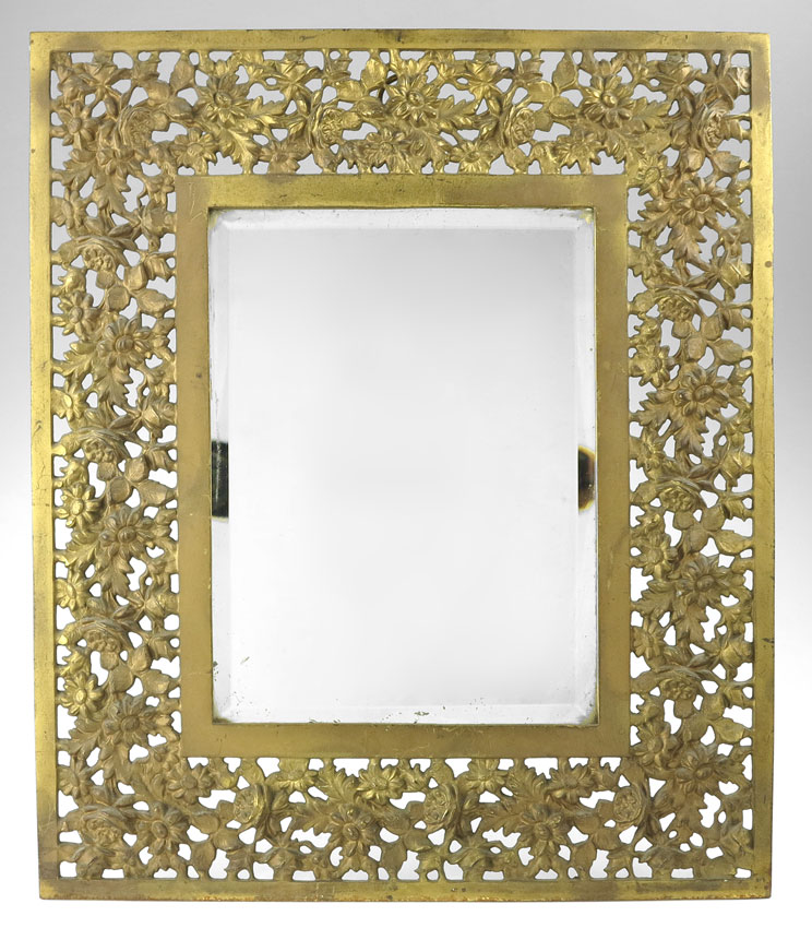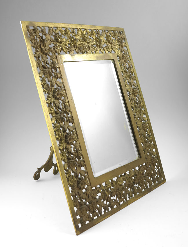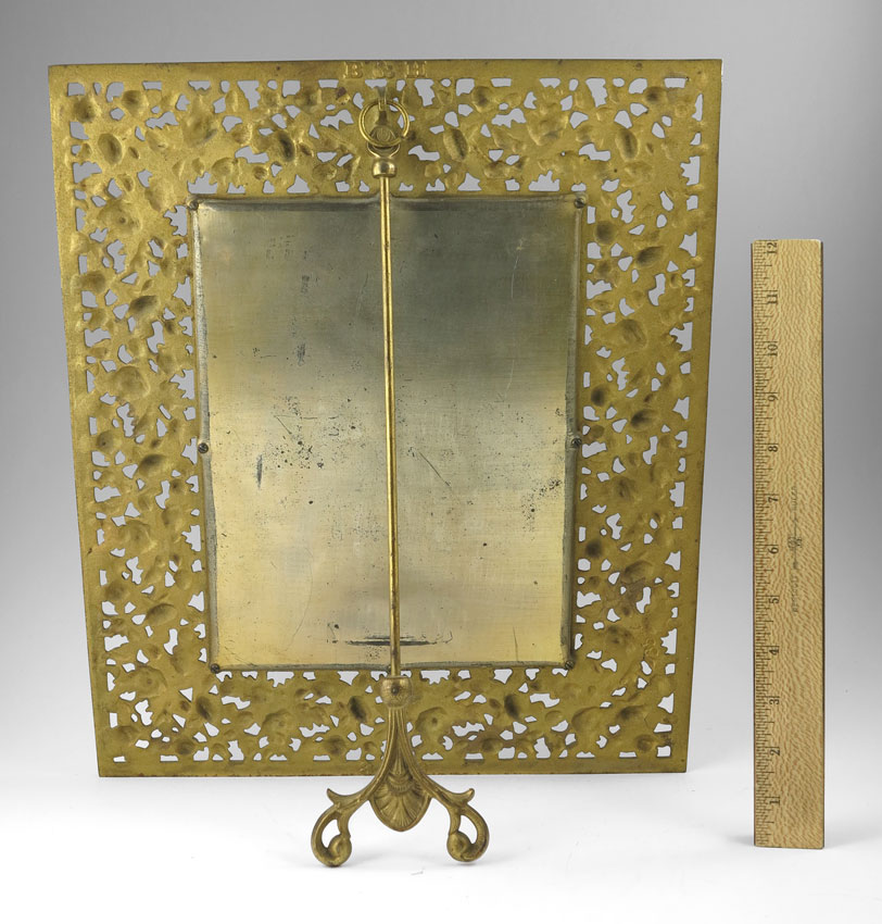 BRADLEY & HUBBARD PATINATED METAL TABLE MIRROR: Open work foliate motif frame marked B & H, 3576. 16 1/4'' x 13 3/4''.