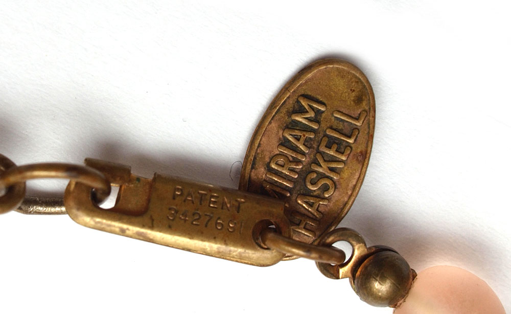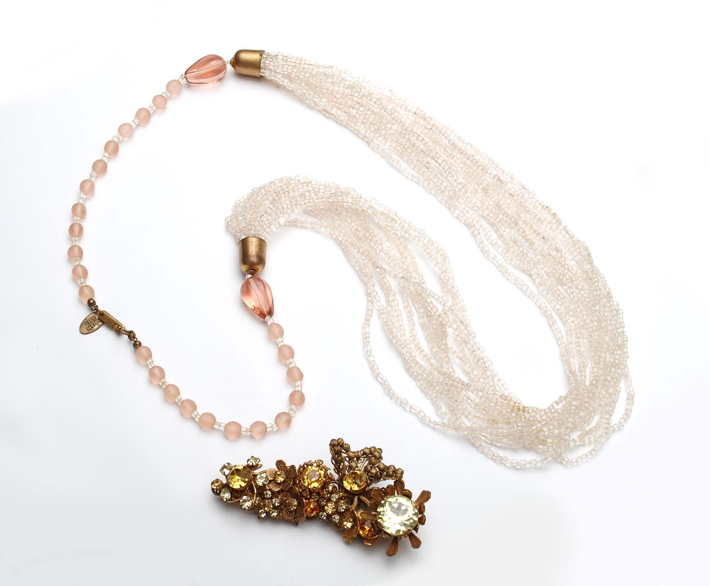 2 PIECE MIRIAM HASKELL COSTUME JEWELRY: 1) Cluster of flower motif brooch in colors of yellow and gold, Miriam Haskell name plate, 3 1/2''L. 2) Multi strand rose colored bead necklace, 30 L. , signed with metal name tag and on the clasp.
