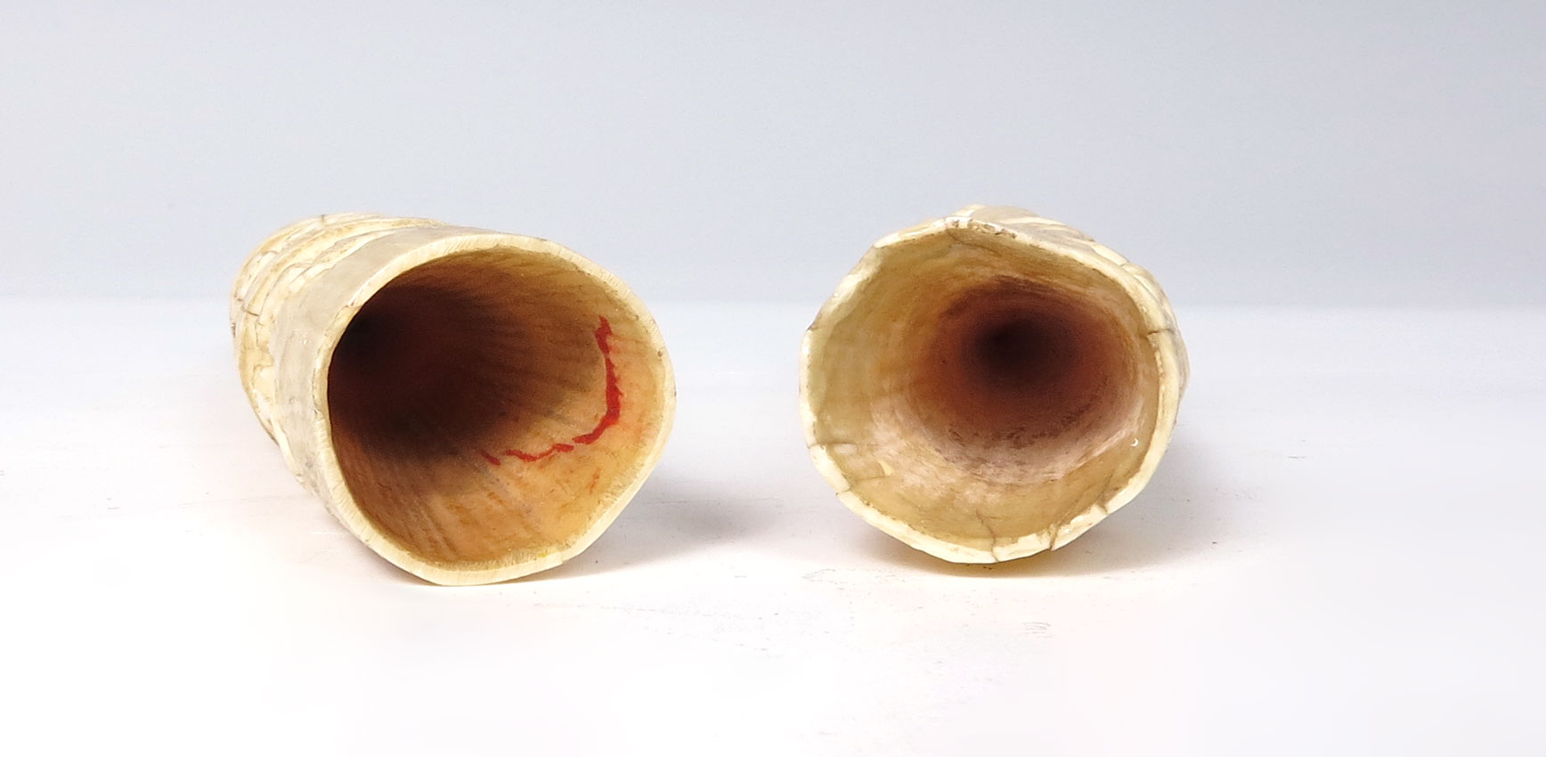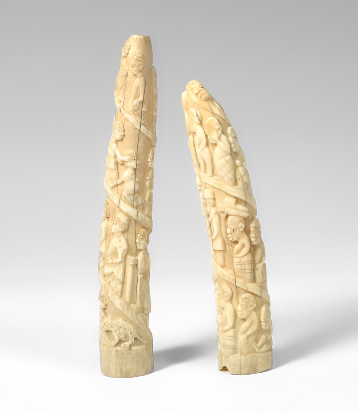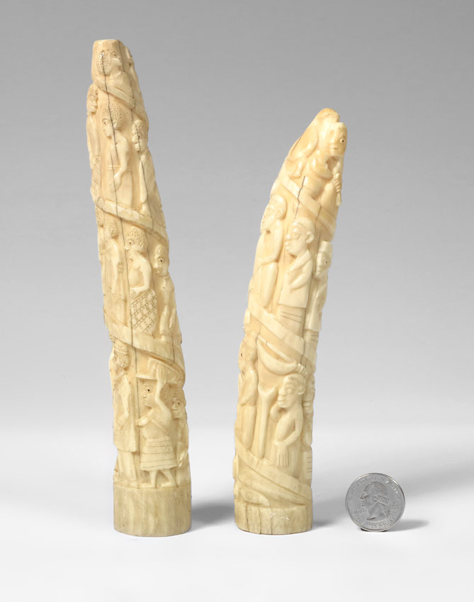 CARVED AFRICAN 2 PIECE CARVED IVORY TUSK FROM CONGO: Carved with figures, 7'' & 8'' long.