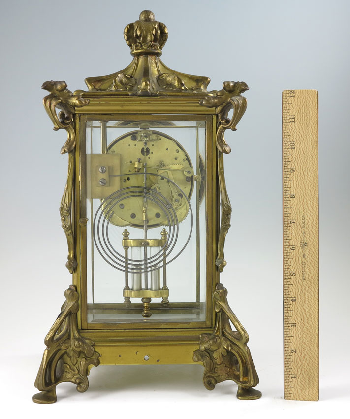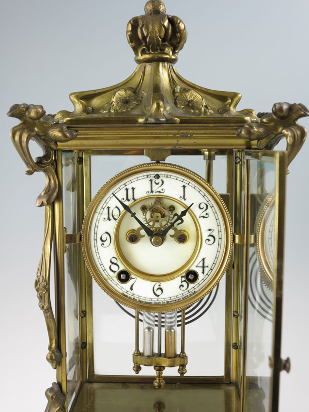 NEW HAVEN ART NOUVEAU CRYSTAL REGULATOR CLOCK: Ornate foliate and floral motif art nouveau metal case with beveled glass sides. Open escapement porcelain dial marked New Haven Clock Co., time and strike movement. Key and faux mercury pendulum in office. 16'' h. x 9'' x 7 1/2''.