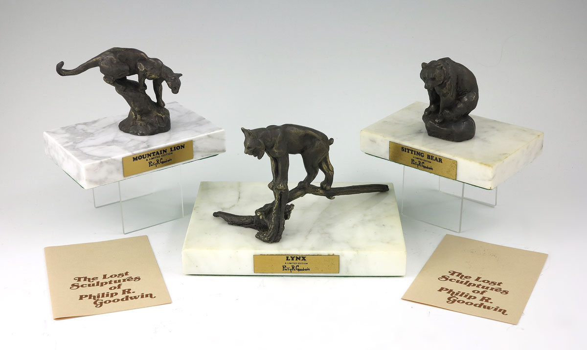 THE LOST SCULPTURES OF PHILIP R. GOODWIN: 3 Bronze Calhouns Collectors Society figures, all #1691, with marble plinth, brass name plaque, pamphlet and shipping box. 1) LYNX 3 1/8'' x 5 1/4'' x 2 1/2'', plinth 3/4'' x 6'' x 4 1/2''; 2) SITTING BEAR 2 1/4'' x 2 3/8'' x 1 5/8'', plinth 3/4 x 4 1/2'' x 3''; 3) MOUNTAIN LION 2 5/8'' x 3 1/2'' x 1 1/4'', plinth 3/4 x 4 1/2'' x 3''.
