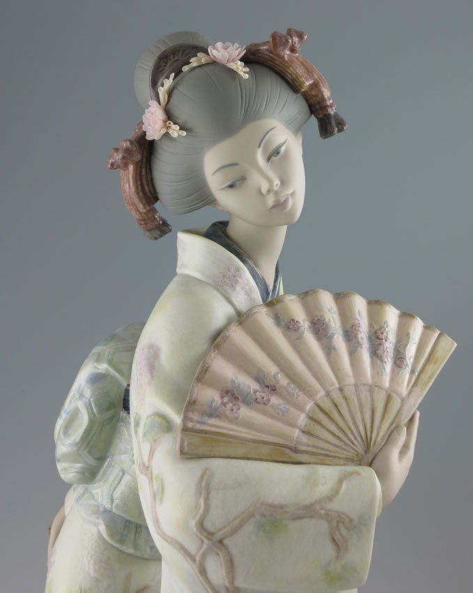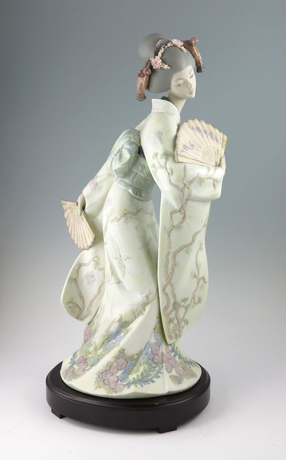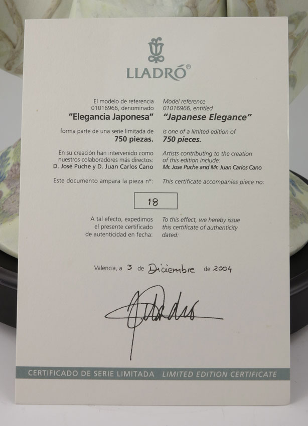 LLADRO PORCELAIN FIGURINE ''JAPANESE ELEGANCE'' 6966: Limited Edition 18/750, matte finish, Jose Puche sculptor, issued 2005 retired 2006, approx. 20 1/2''h. Sold with original box and packing, stand and certificate.