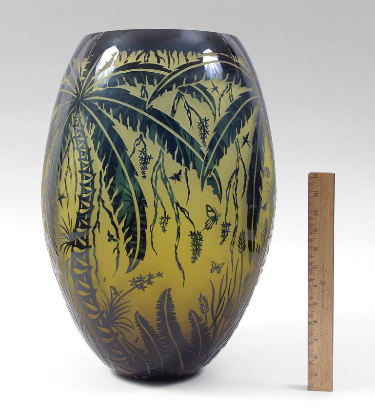 McCLELLAN, Duncan, (American 1955-): Monumental overlay and sand etched glass vase, ''My Garden'', showing up close details of life in a garden. Deep aqua cut to green. 20'' tall. Signed. Original retail was $5200.
