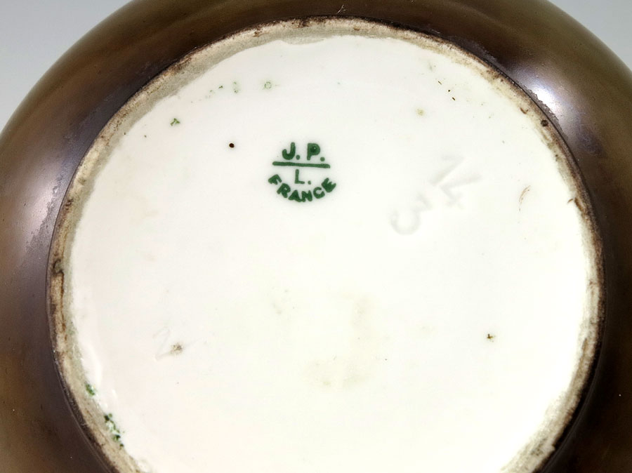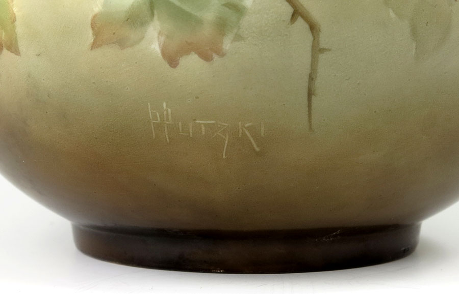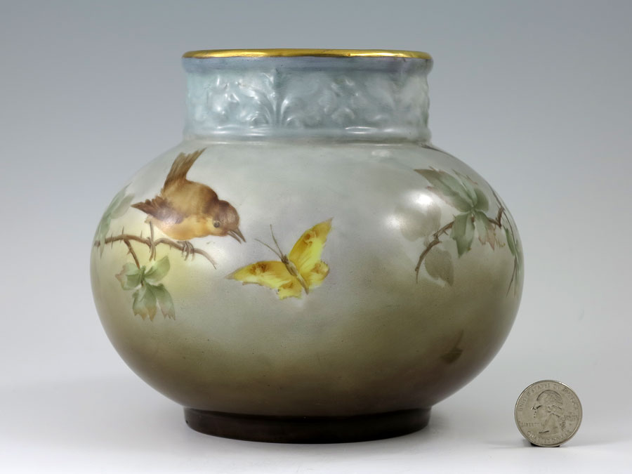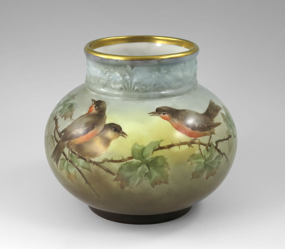 JEAN POUYAT FRENCH LIMOGES PORCELAIN VASE: Ca, 1891-1932. Embossed neck, globular body decorated with budding branches and robins. Artist signed, 5 1/2''h., 6 1/2'' dia. at the widest.