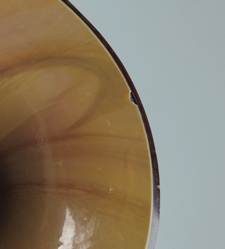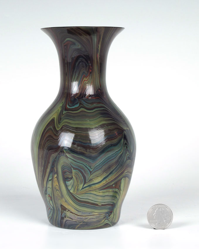 TIFFANY MARBLEIZED ART GLASS PAPERWEIGHT VASE: Method seen in the book ''Art Glass Nouveau'' by Ray & Lee Grover, page 96. Layered glass with the marbleized decoration over the agate glass interior. 7 1/2'' tall. Unsigned.