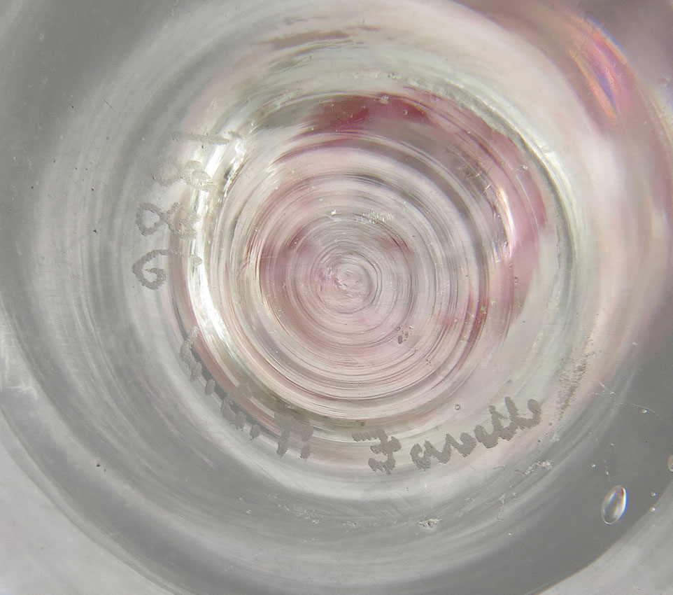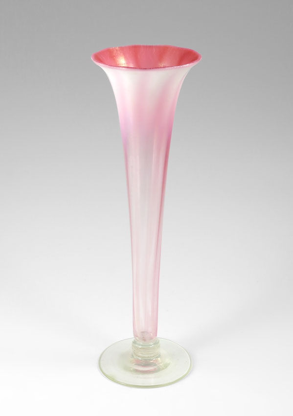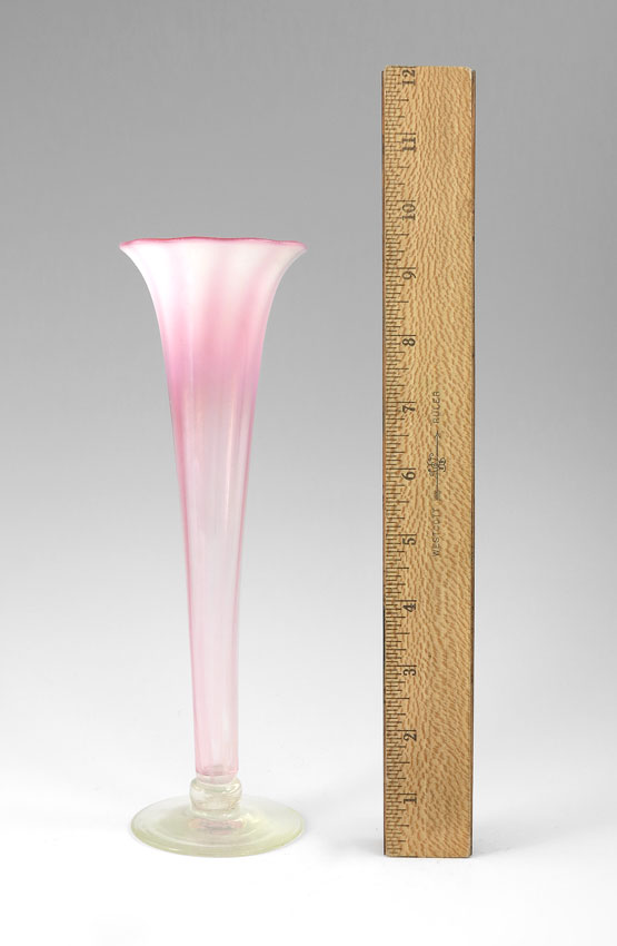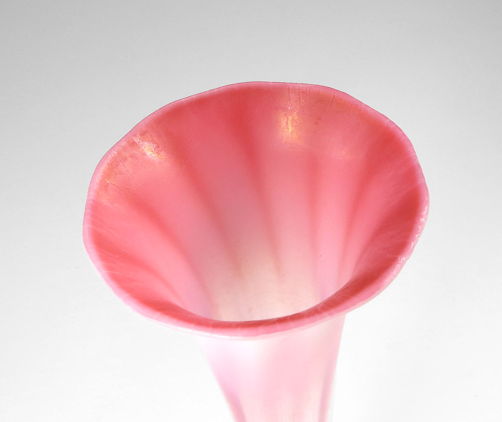 SIGNED TIFFANY FAVRILLE PASTEL GLASS VASE: Iridescent rose interior, 9 1/2'' tall. Signed ''1886 LCT Favrille''.