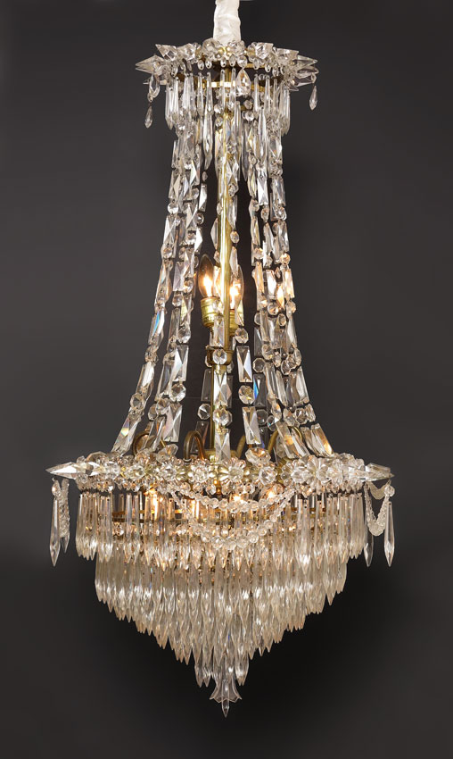 FRENCH EMPIRE STYLE CRYSTAL CHANDELIER: For the high ceiling, the rod above the chandelier is approx. 59''. 7 tiers of prisms graduating inward. Chandelier, excluding the rod measures approx. 36'' x 21''.