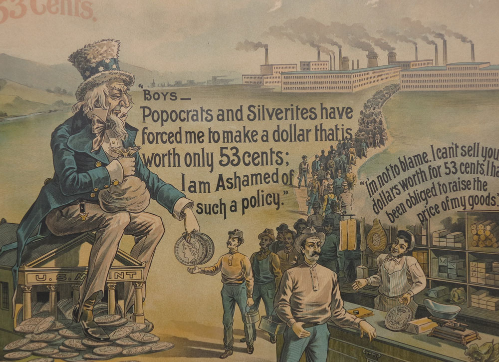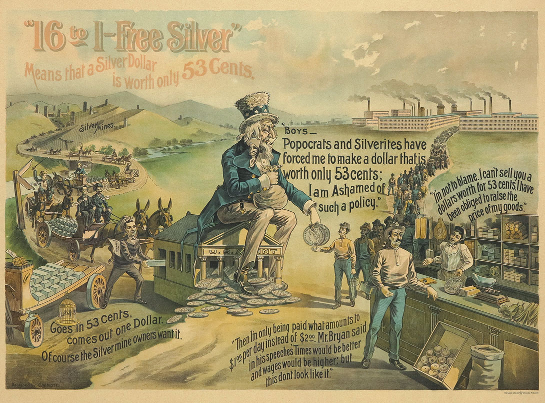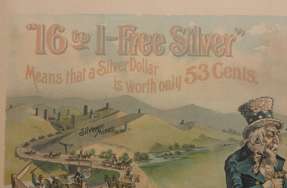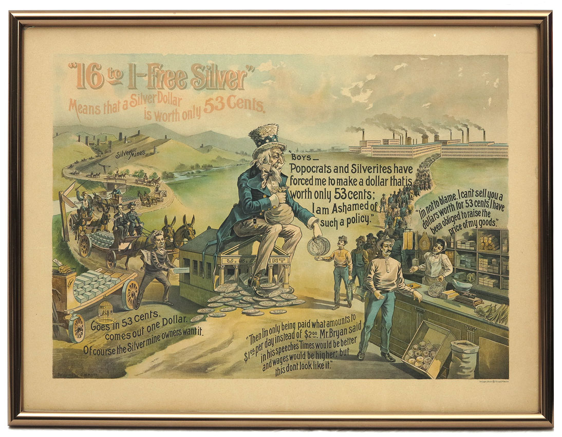 ANTI WILLIAM JENNINGS BRYAN FREE SILVER POLITICAL CAMPAIGN POSTER: Circa 1896 political campaign lithograph poster designed by C. W. Mott, printed by Gugler Litho, Chicago & Milwaukee. Featuring Uncle Sam, factory workers, store owners and silver miners. Text includes ''16 to 1, Free Silver'' with anti-Bryan statements regarding his free silver campaign. Image sight size 17 1/2'' x 24 1/2'', contemporary frame under Lexan 22 1/2'' x 29 1/2''.