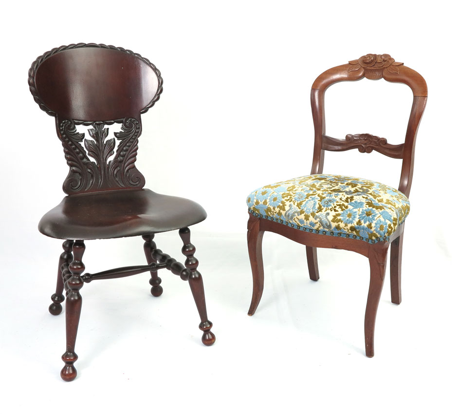 2 VICTORIAN CARVED PARLOR CHAIRS: To include 1) Carved back with rope twist rim top section, open work foliate motif lower section. Turned legs and stretchers. 34 1/4'' h. x 19'' x 19''. 2) Carved crest and back splay with carved and shaped front legs. Blue floral upholstery. 34 1/4'' x 19'' x 21 1/2''.