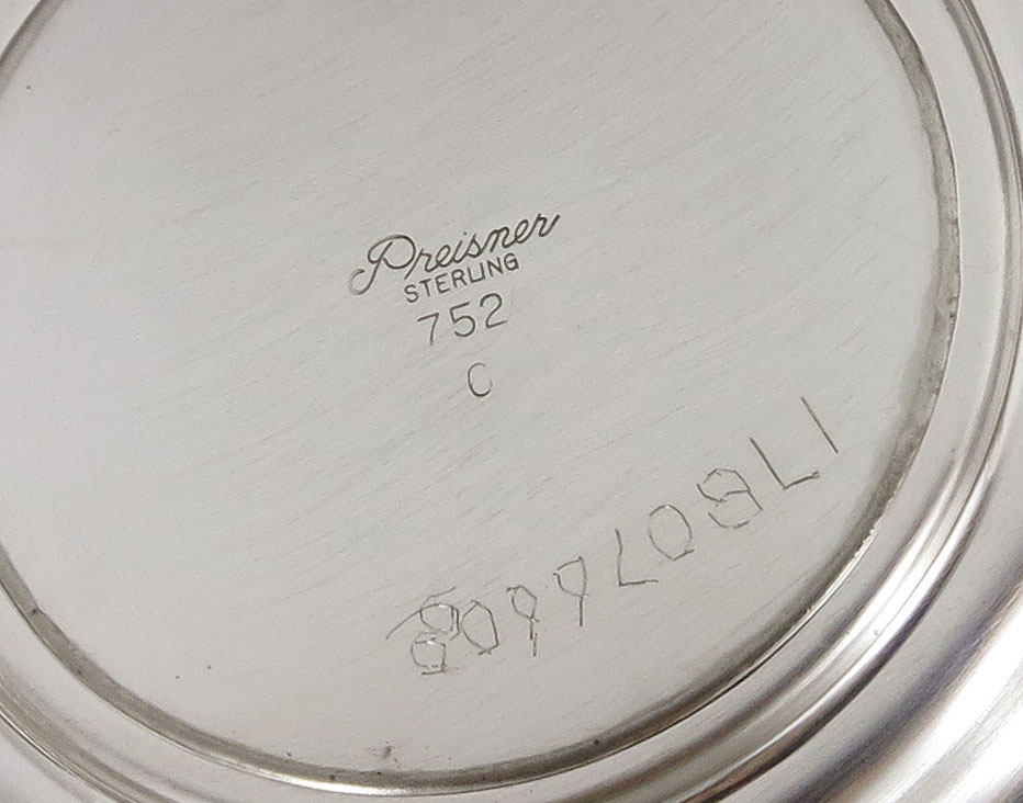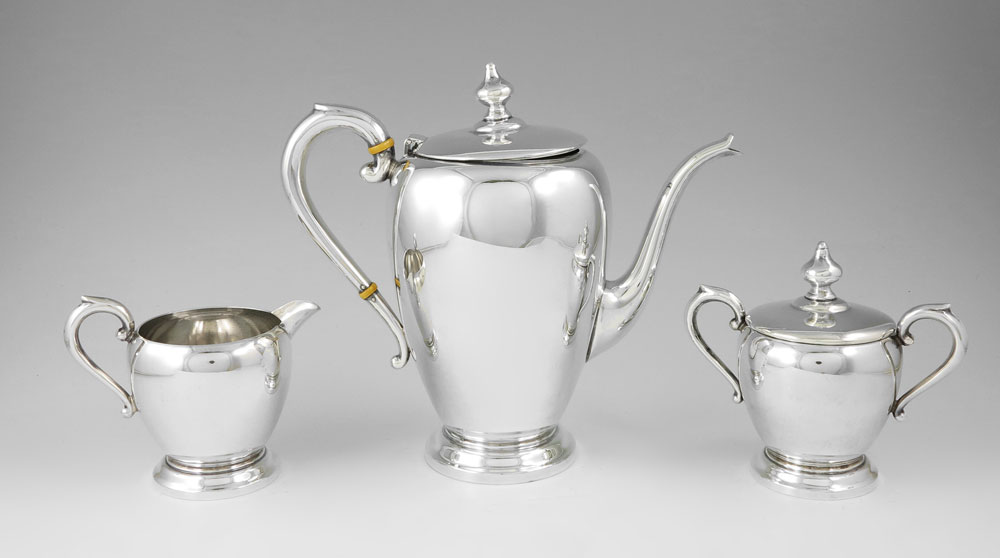 3 PIECE PREISNER STERLING TEA SERVICE: To include 1) Tea pot with hinged lid, plastic heat shields. 8'' h. x 9''. 2) Open creamer, 3 7/8'' h. x 4 3/4''. 3) Covered sugar, 4 3/4'' h. x 5 3/8''. Approx. 24 troy oz.