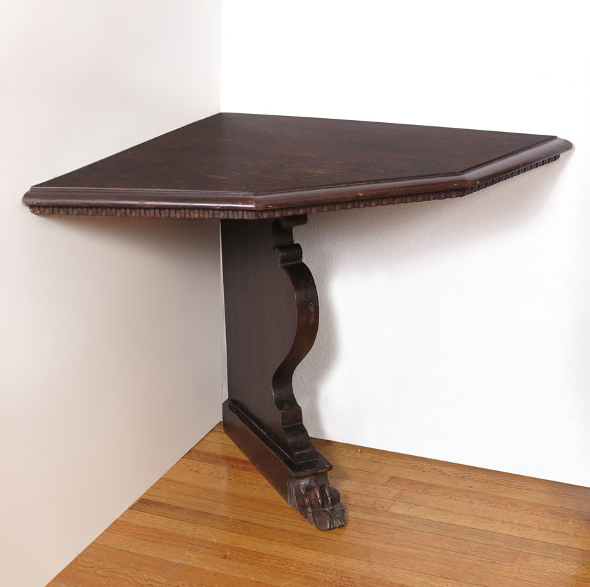 CARVED CORNER TABLE: Shaped top over single support with carved foot. 32'' h. x 32'' x 33 1/2''.