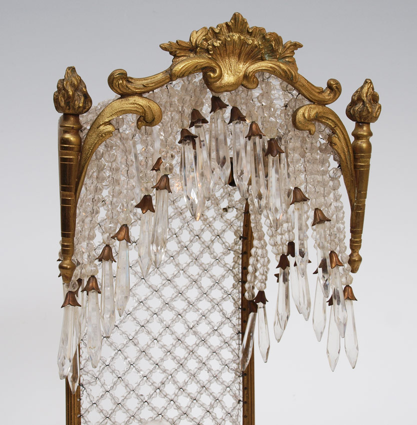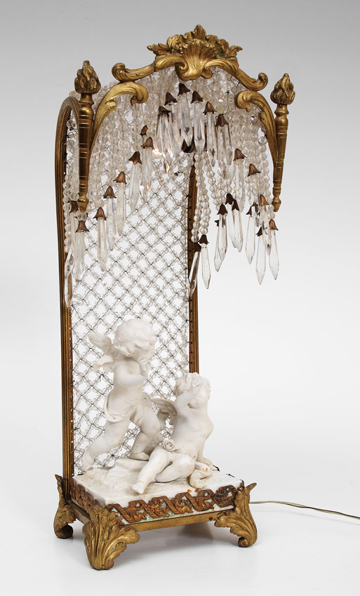 PARIAN BISQUE FIGURAL LAMP: With faceted glass bead ''curtain''. 16'' tall x 7'' x 6''.