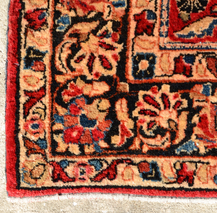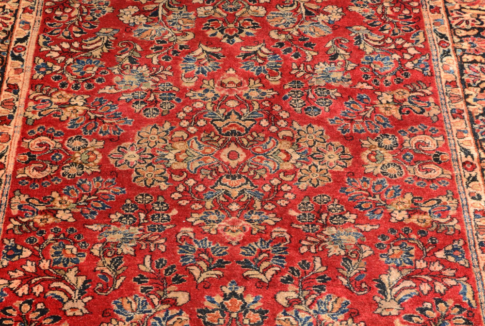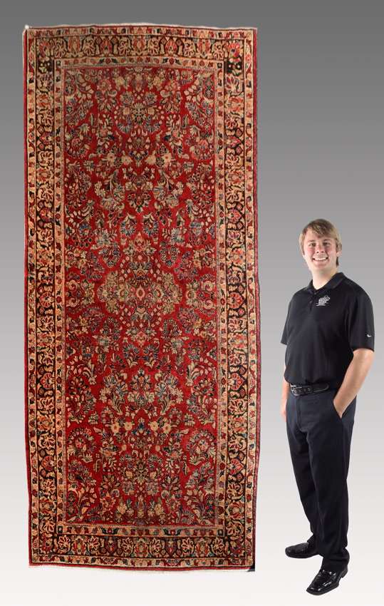 SEMI-ANTIQUE PERSIAN HAND KNOTTED WOOL RUG, 5' 2'' x 10' 2'': This unusual sized Sarouk is a gallery or corridor shape that in the old days would have been used in an oversized hallway that also served as the family ''gallery'' of portraits of ancestors. Today, this shape is great for defining a sitting area in a larger room. This is a beautiful, ''meaty'' Sarouk with a lively interpretation of the flower sprays, but with a slightly more open field. The red ground and the others colors are clear and the design is well drawn.