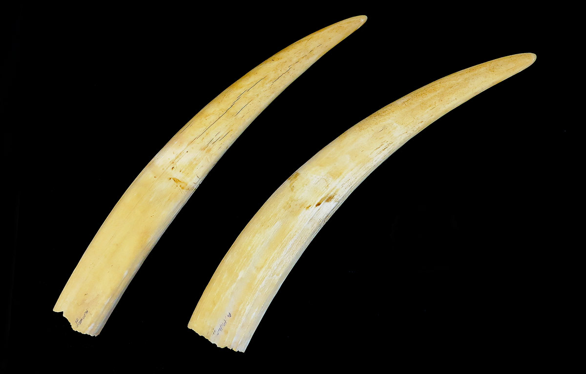 2 PIECE WALRUS IVORY TUSKS: Overall lengths 16'' and 15 3/4''. Approx. 2.9 lbs total.