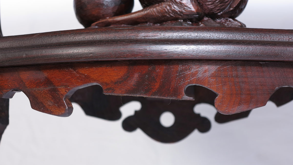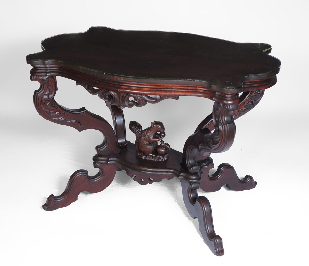 CARVED VICTORIAN CENTER TABLE WITH SQUIRREL FINIAL: Shaped top over carved and shaped supports, unique squirrel finial on lower stretcher / shelf, on 4 shaped legs. Sold with matching shaped glass top, probably started its life with a marble top. Overall 28'' h. x 40 1/4'' x 26 1/4''.