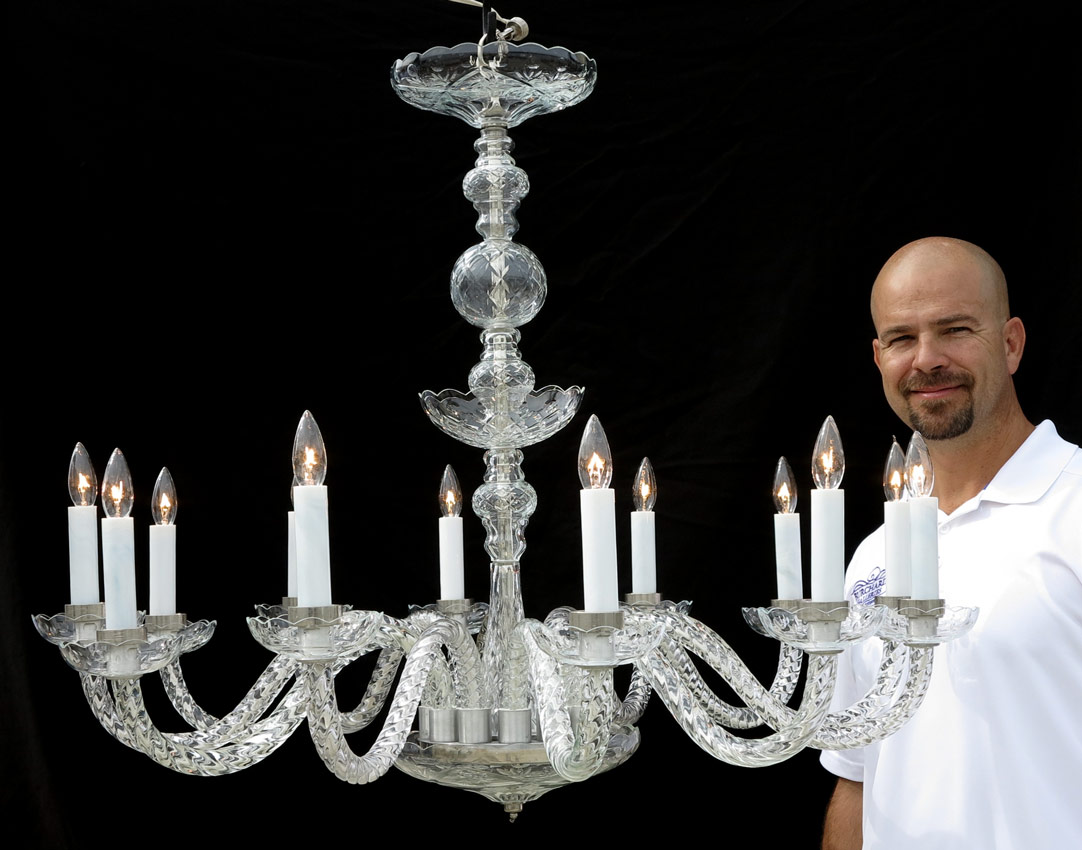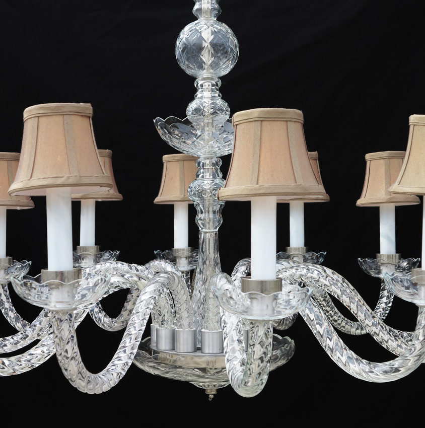 12 ARM GLASS CHANDELIER: Cut glass shaft with 12 rope twist glass arms. Diminutive cloth lamp shades. Approx. 31 3/4'' h. x 38'' dia.