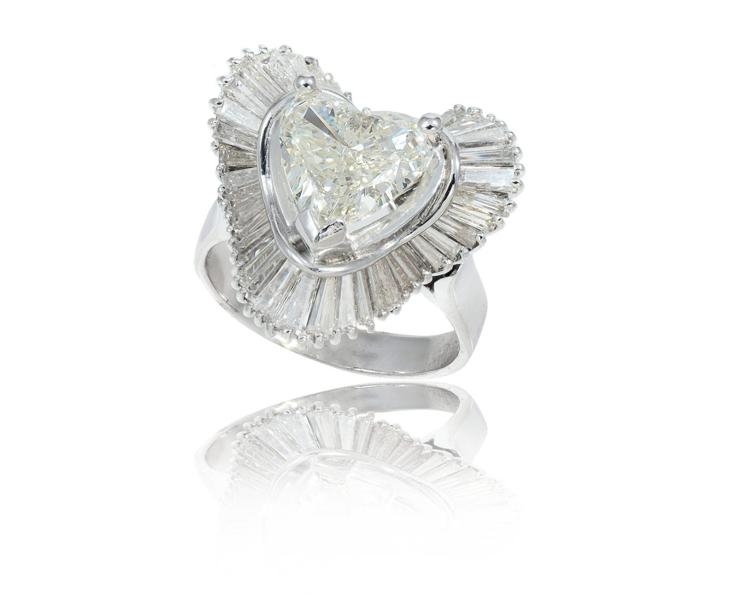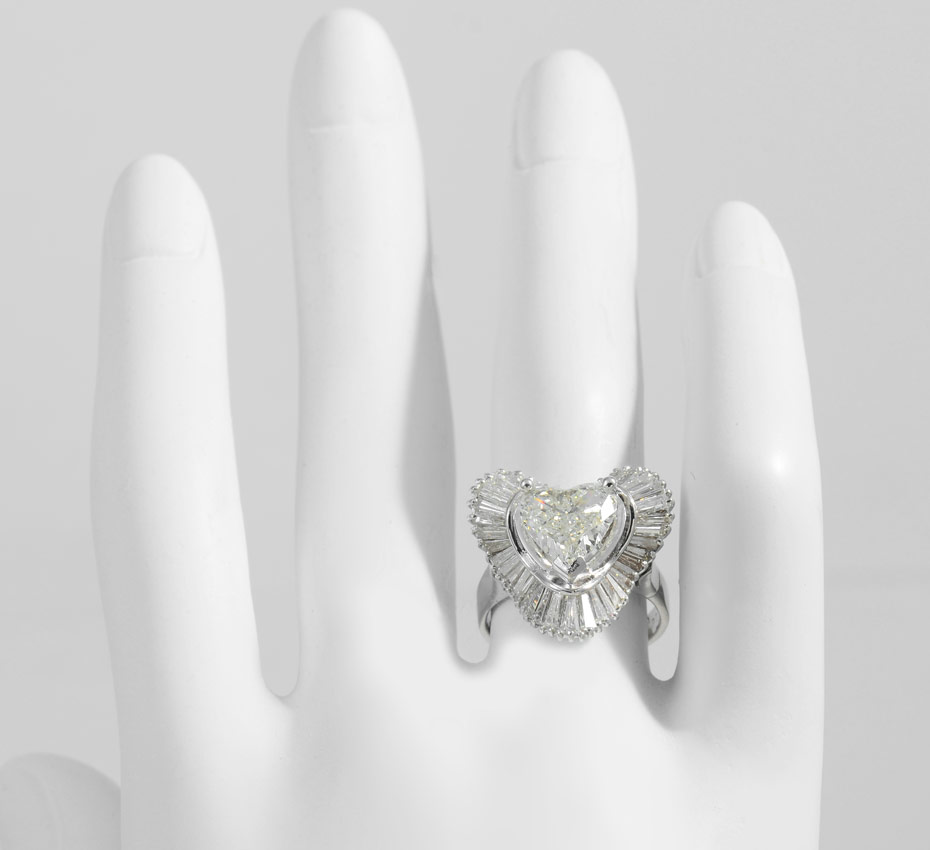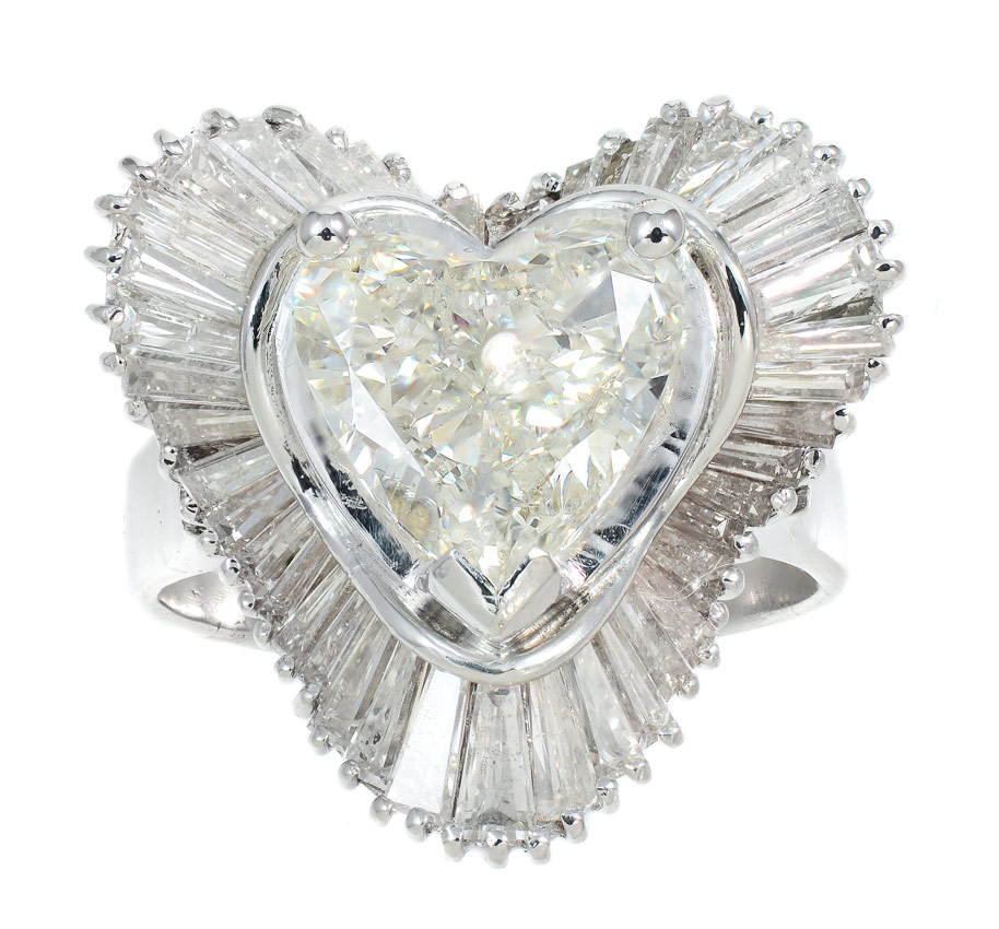1.97 CT CENTER HEART SHAPED DIAMOND: 14K white gold ring centers an approx. 1.97 Ct. heart brilliant diamond of VS1 clarity and K color. Framed by a wave of 41 baguette cut diamonds totaling approx. 1.25 Ct., averaging SI in clarity and H-I color. Center is prong set, baguettes half channel and prong set. Size 5.75. Weight 5.9 grams. A current Florida Diamond Appraisers GIA graduates appraisal for $13,375. is available.