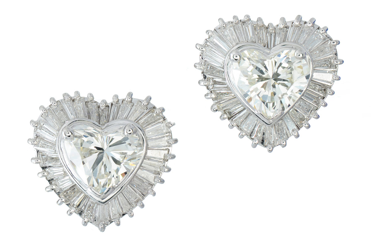 3.65 CTW DIAMOND HEART EARRINGS: 14K white gold earrings center heart shaped cut diamonds, one at 1.16 Ct, the other 1.19 Ct., SI1 and S1 in clarity and K color. Framed by 56 tapered baguette cut diamonds totaling approx, 1.30 Ct., averaging VS in clarity and G-H color. A current Florida Diamond Appraisers GIA graduates appraisal for $13,750 is available.