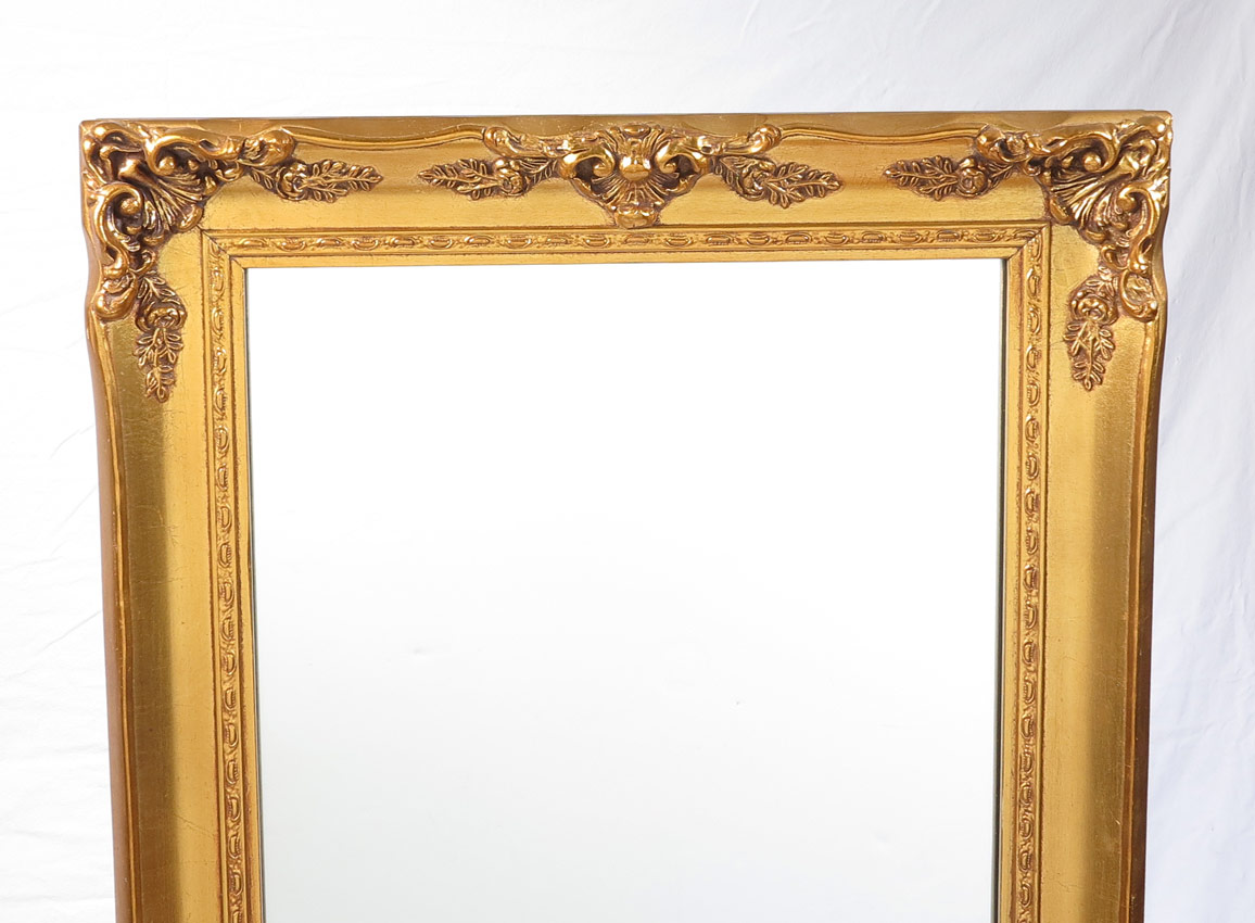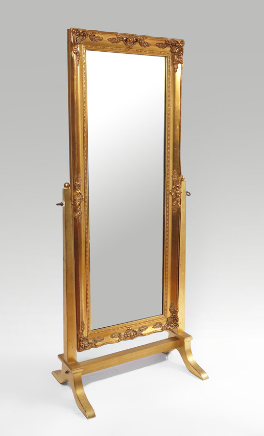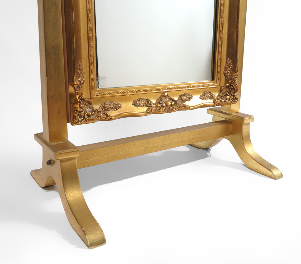 GILT WOOD CHEVAL DRESSING MIRROR: Carved gilt wood frame mirror, pivots on a gilt wood stand. Overall 61 1/2'' h. x 25 1/2'' x 17''.