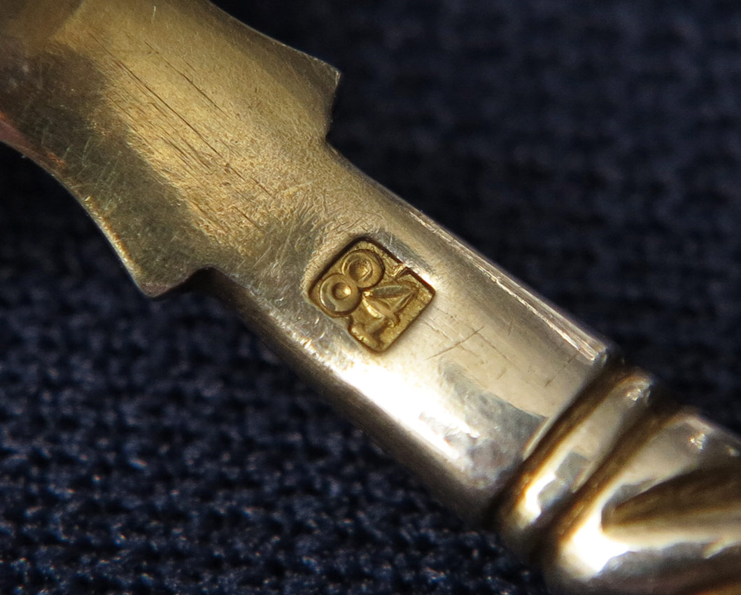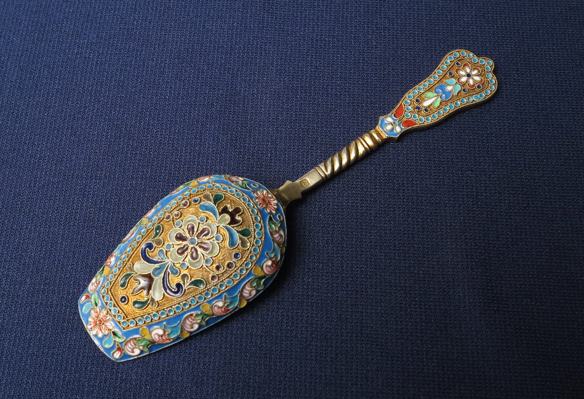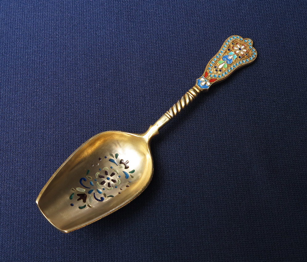 RUSSIAN SILVER PLIQUE A JOUR SPOON: Russian 84 zolotnik silver mark with vermeil wash, plique a jour and enamel on back of bowl, enamel at top of handle. Sold as marked. 5 1/4'' long, approx. 1.4 troy oz. inclusive.