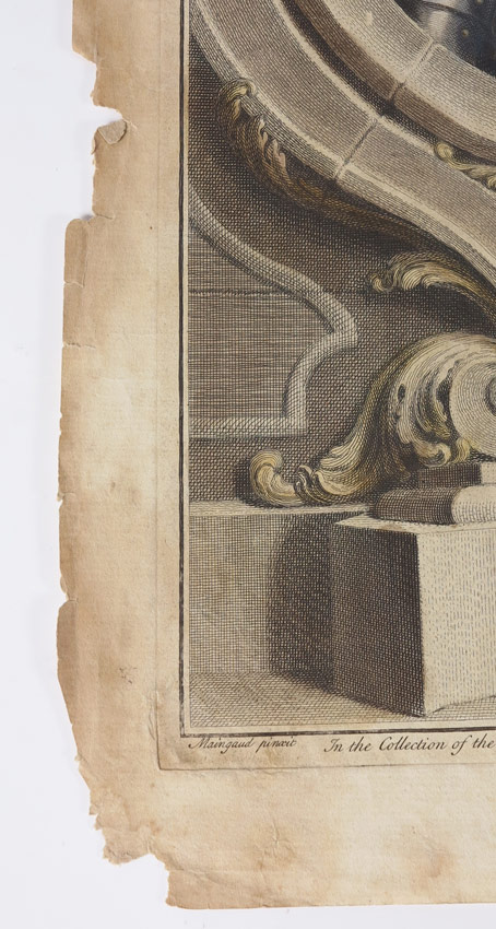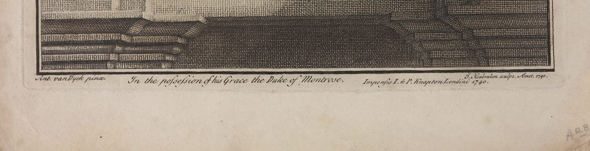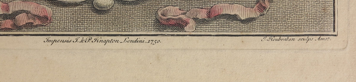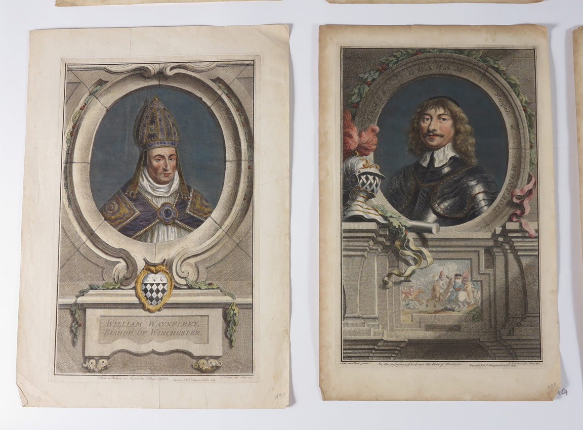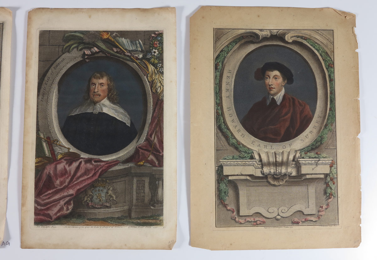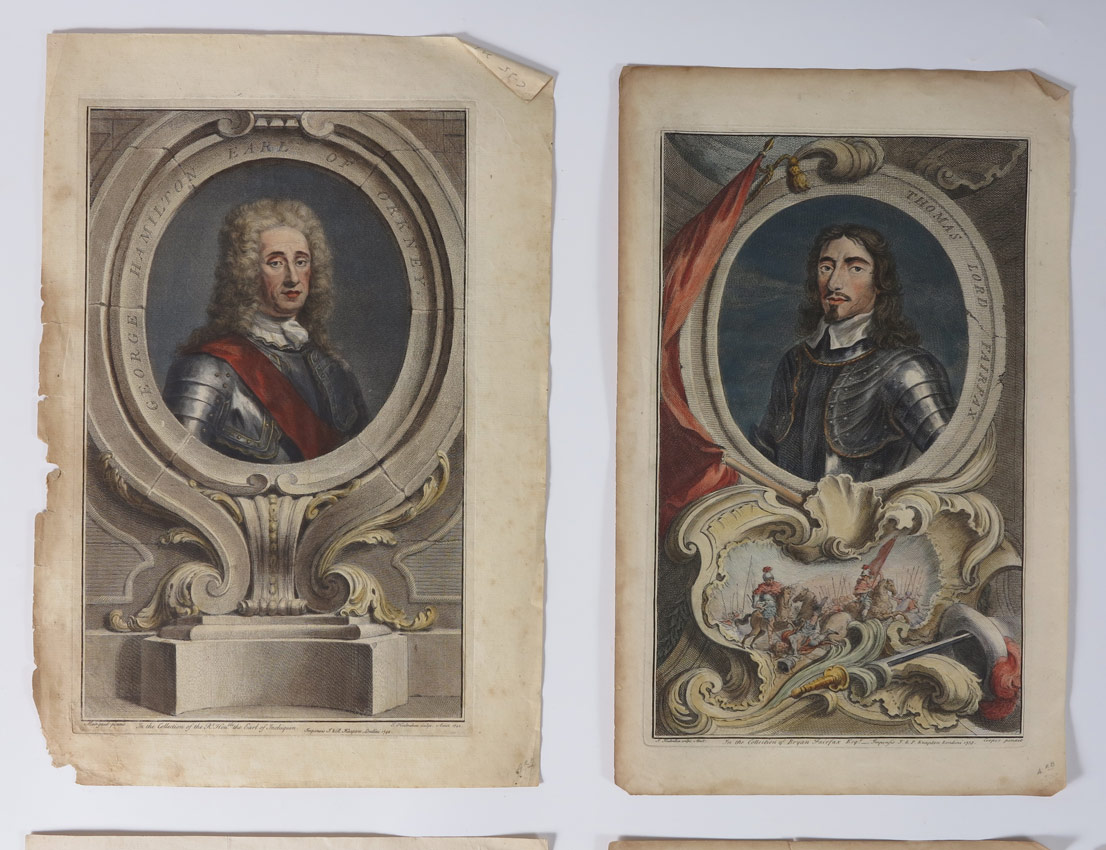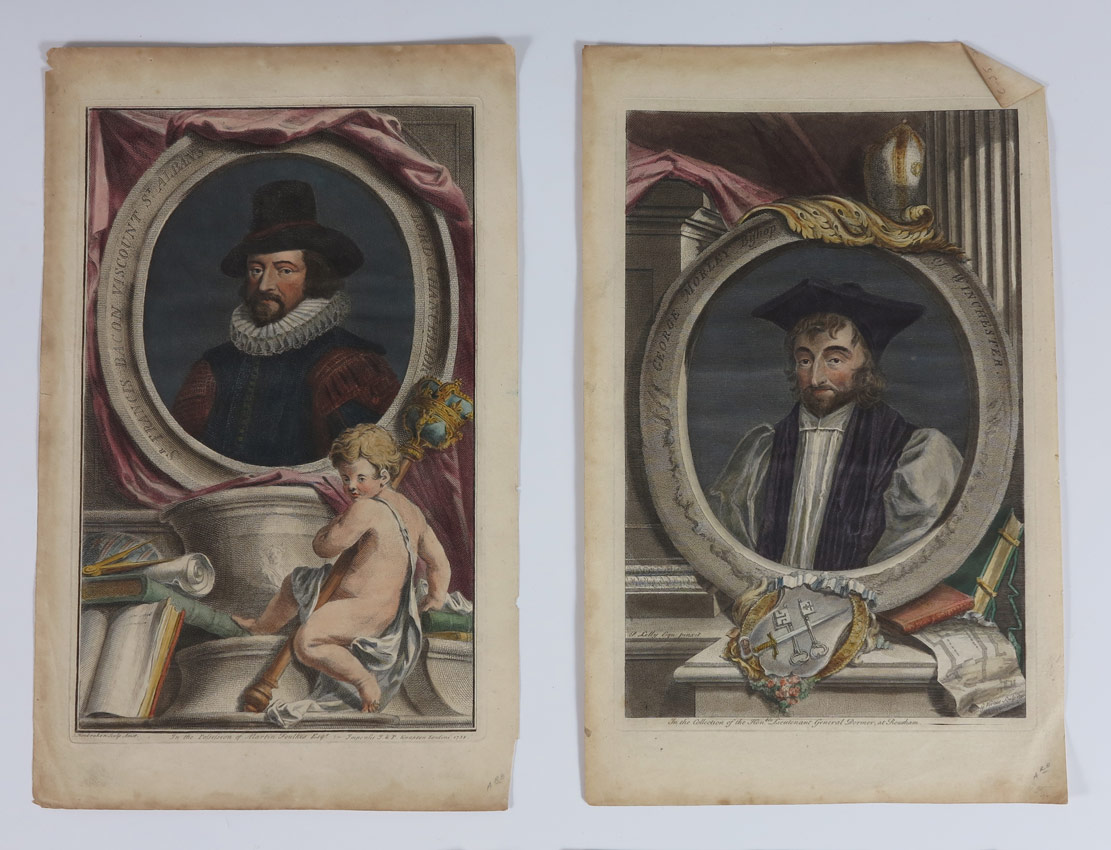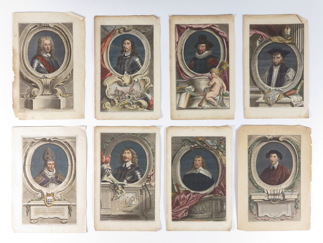 8 HAND COLORED ENGRAVINGS OF NOBILITY: 8 pieces total all after the original artist with 6 from Jacob Houbraken (Dutch 1698-1780) to include 1) ''James Graham, Marquis of Montrose'', impression 14 3/4'' x 91/4'', overall 17'' x 10 5/8''. 2) ''Sir Francis Bacon, Viscount St. Albans, Lord Chancellor'', impression 14 1/4'' x 9 1/4'', overall 17'' x 10 5/8''. 3) ''Henry Howard, Earl of Surrey'', impression 14 1/2'' x 9 1/4'', overall 17 1/4'' x 12 1/8''. 4) ''George Hamilton, Earl of Orkney'', impression 14 3/4'' x 9 1/4'', overall 17 3/8'' x 11 3/4''. 5) ''William Waynfleet, Bishop of Winchester'', impression 14 3/4'' x 9 1/4'', overall 17 3/8'' x 12 1/4''. 6) ''Thomas Lord Fairfax'', impression 14 1/2'' x 9'', overall 17'' x 10 5/8''. Jacob learned the art of engraving from his father, Arnold Houbraken (1660-1719). In 1707 he moved to Amsterdam, where for years he helped his father with his magnum opus, his art historical work De Groote Schouburgh der Nederlantsche konstschilders en schilderessen (1718-1721). 2 others by George Vertue to include 7) ''George Morley, Bishop of Winchester'', impression 14'' x 9 1/4'', overall 17'' x 10 1/2''. 8) ''Francis, Earl of Bedford'', impression 14 1/4'' x 9 1/4'', overall 17'' x 10 5/8''. All are loose.