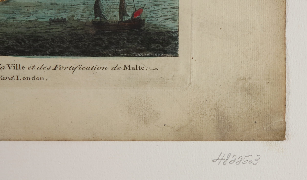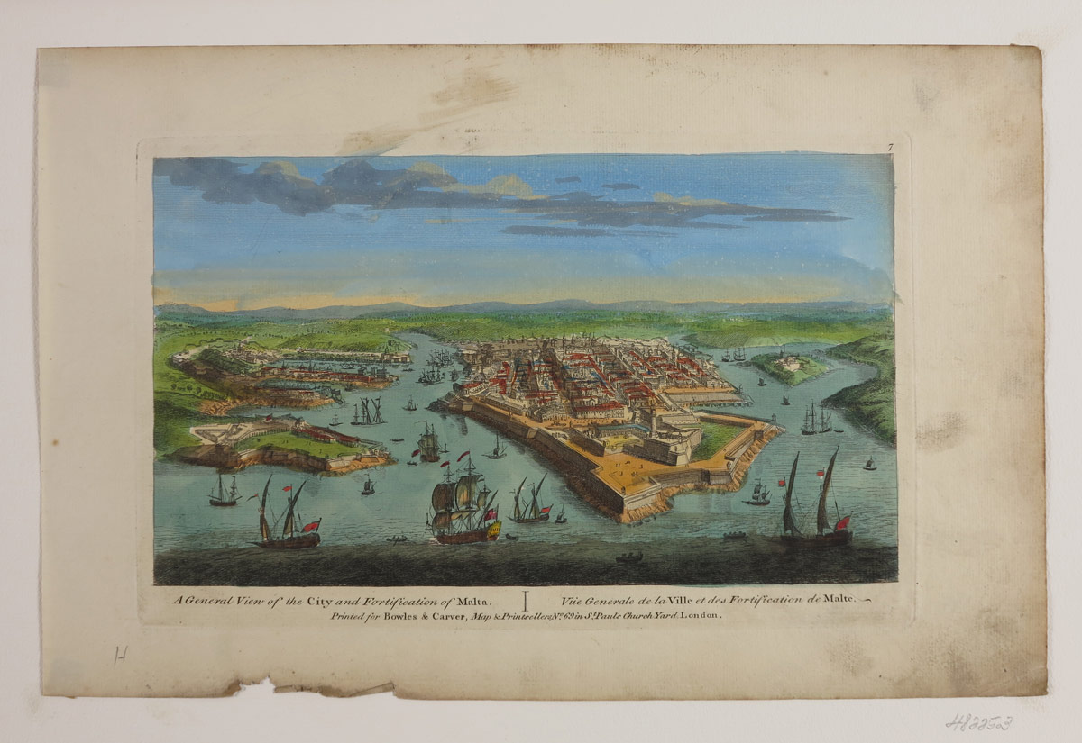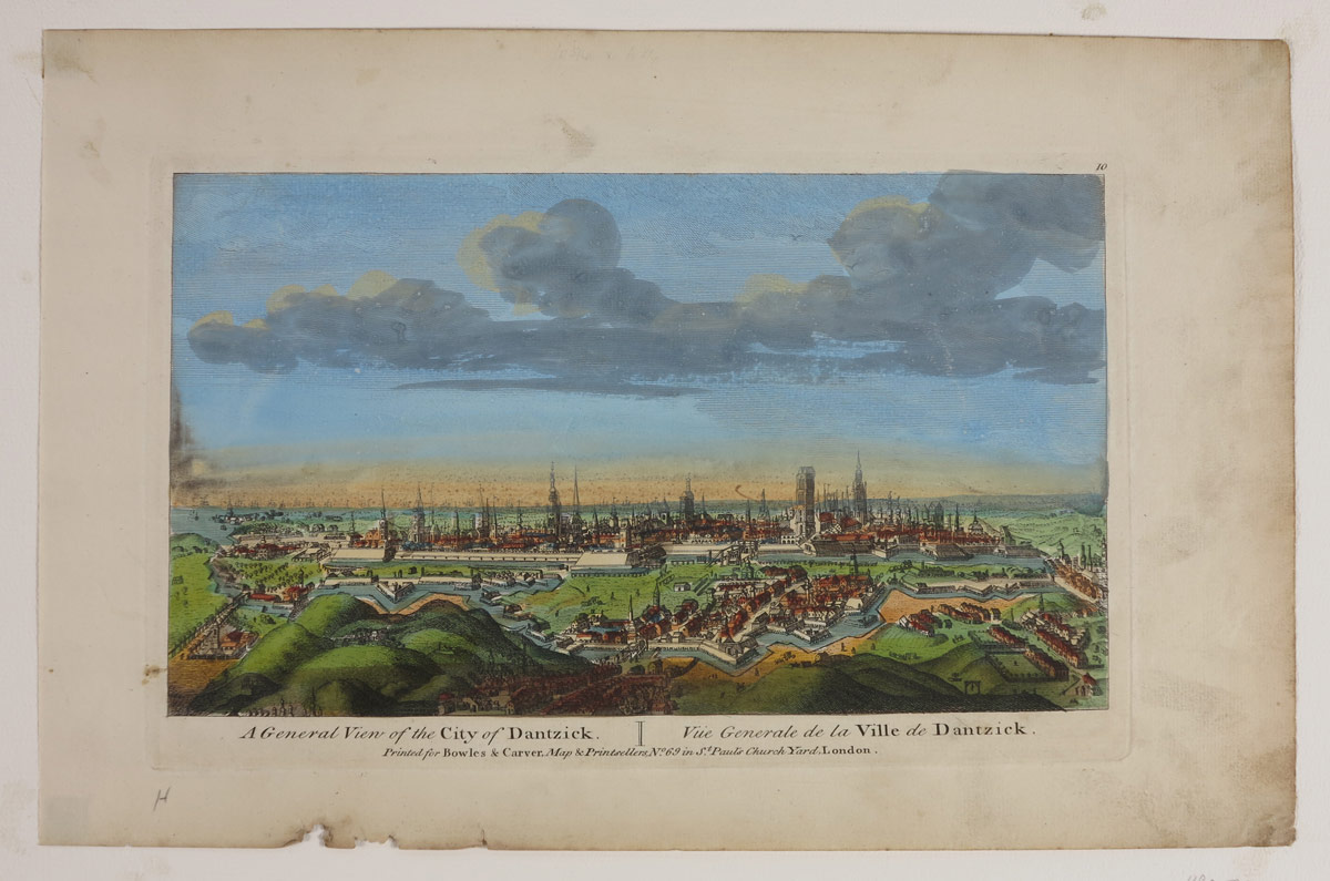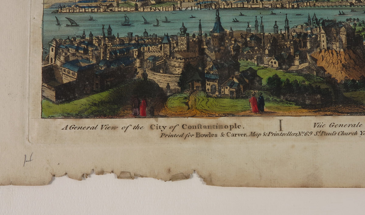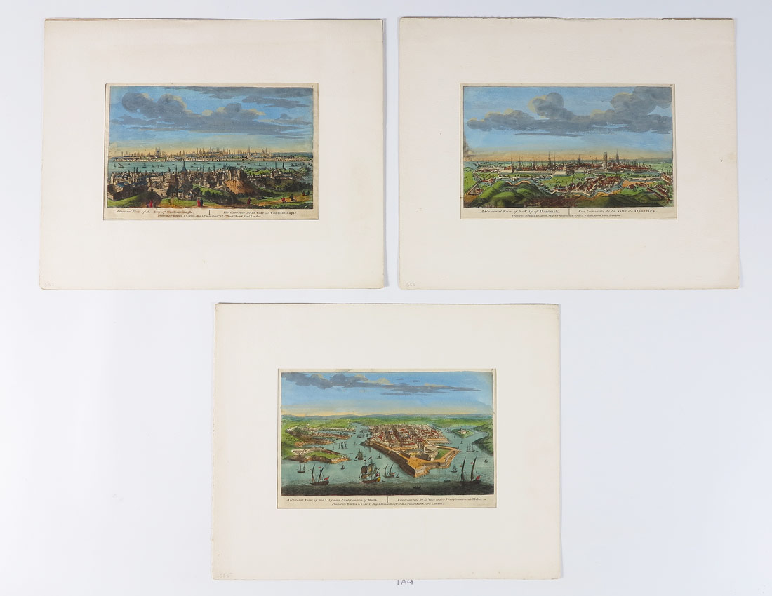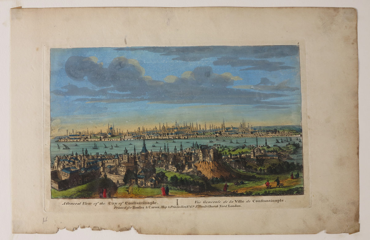 3 BOWLES & CARVER HAND TINTED CITY VIEW ENGRAVINGS: 3 pieces total to include 1) ''A General View of the City and Fortification of Malta'', impression 7'' x 11'', overall page 9'' x 14''. 2) ''A General View of the City of Dantzick'', impression 7'' x 11'', overall page 9'' x 14''. 3) ''A General View of the City of Constantinople, impression 6 3/4'' x 10 3/4'', page 9 1/8'' x 14''. All taped down on corners and matted. The firm of Bowles & Carver flourished in London from 1793 until 1832. Upon the death of Carington Bowles (1724-1793), his firm was taken over by his son Henry Carington Bowles (1763-1830). Bowles and (Samuel) Carver published prints and maps from old copper plates and disseminated them throughout the world. That they were targeting multinational markets is evident by the use of two or more languages in the text of the prints they chose to publish. The gracefulness of the lines on these landscapes shows a marked improvement on the primitive vues d'optique that were published in France and Germany in earlier decades. Overall measurement of each in mat 13 1/2'' x 16 7/8''.