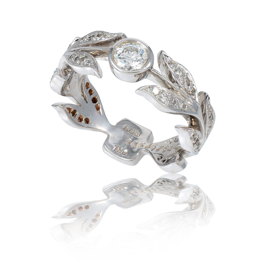 UNIQUE DIAMOND LAUREL WREATH RING: 18k white gold band ring in the form of a wreath or corona, centering a round brilliant diamond, approx. .24 Ct.. VS1 in clarity and F color. An additional 48 round brilliant diamonds total approx. .29 Ct., averaging VS in clarity and F color. Center stone is bezel set, others diamonds are bead set. Size 6. Weight 5.4 grams.